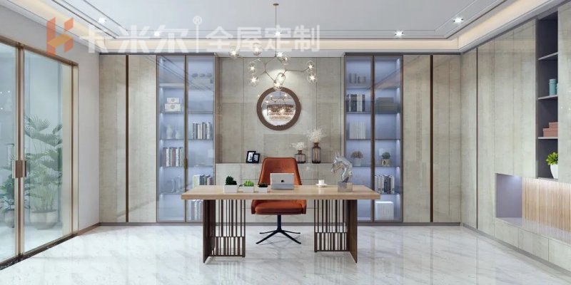 書房與客廳相連,光線充足,十分開敞透亮。恢弘大氣的書柜貼合空間而立,封閉區(qū)與展示區(qū)分明,簡(jiǎn)潔中又不失裝飾的點(diǎn)綴,休息之余的陶冶情操也能如此奢華。