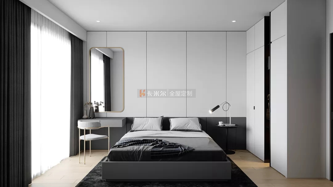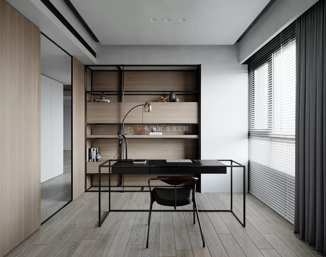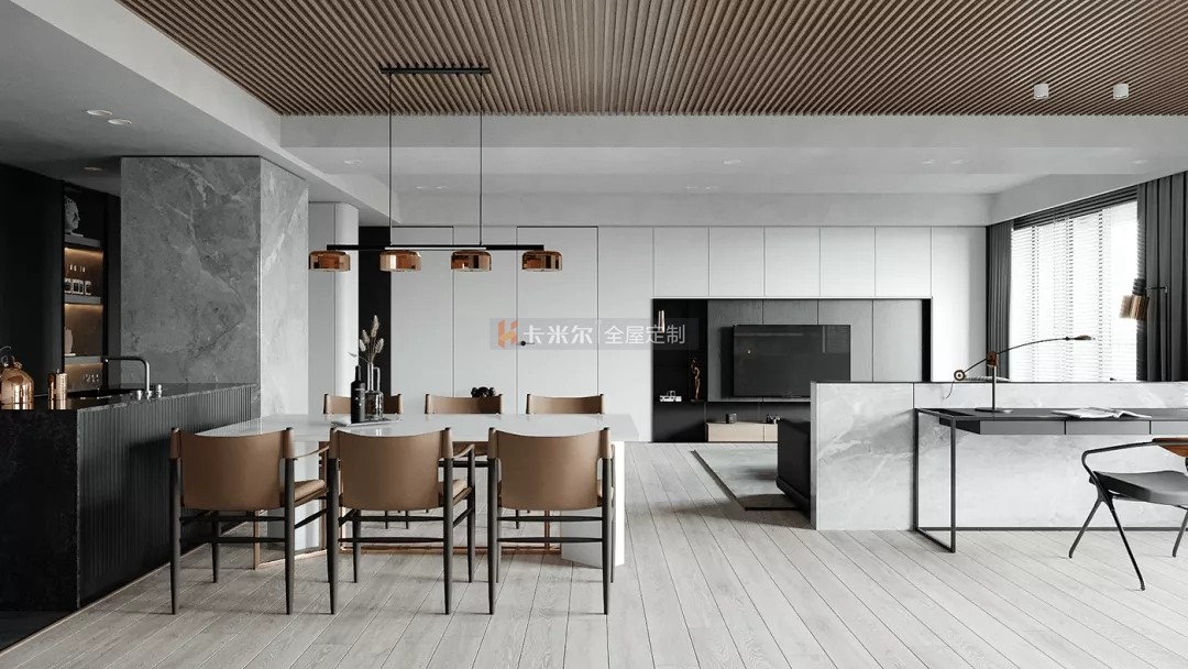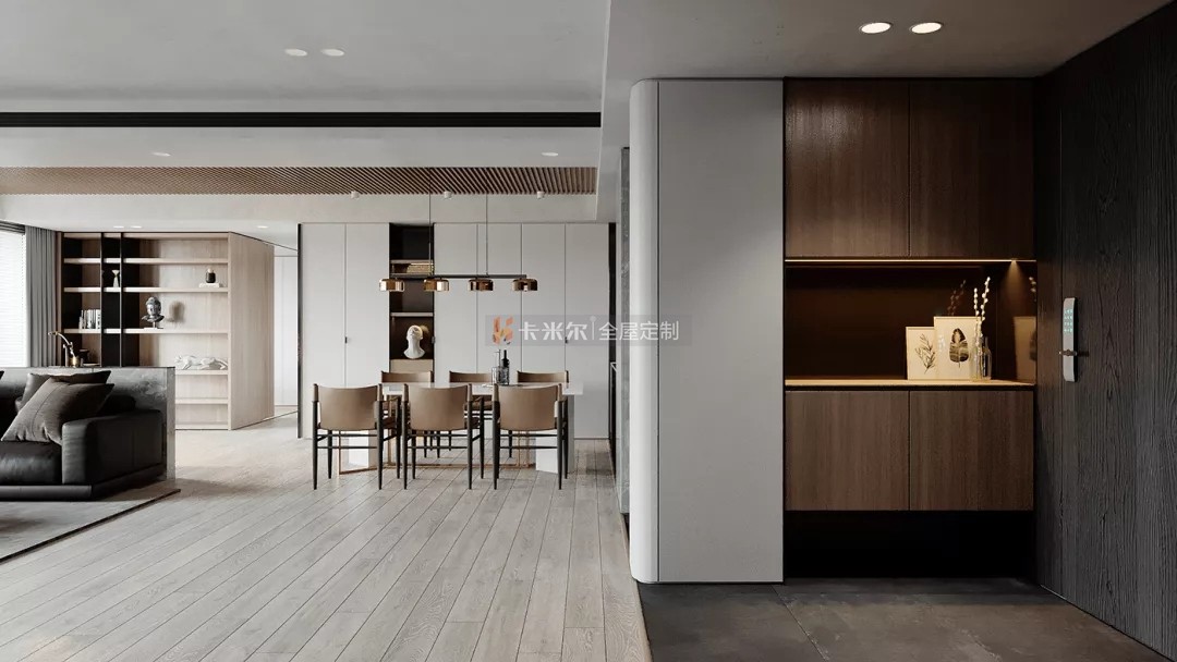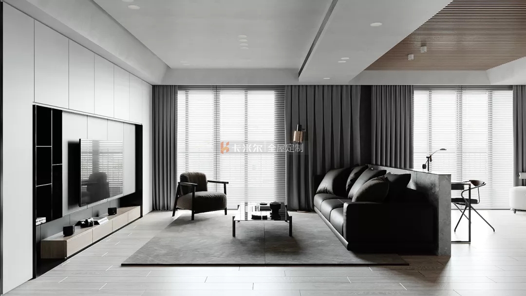 以溫馨舒適的木色,高級黑白灰為主色調,搭配鮮明利落的黑色,色彩與材質的對比使用使得整個家充滿更多設計感,使整個空間簡約不失功能性。