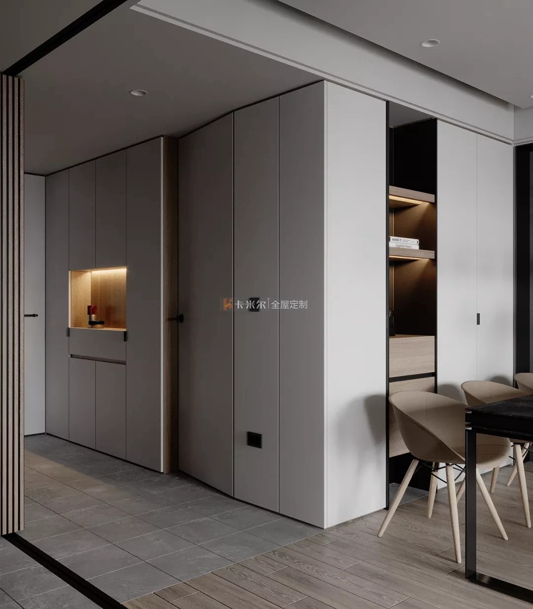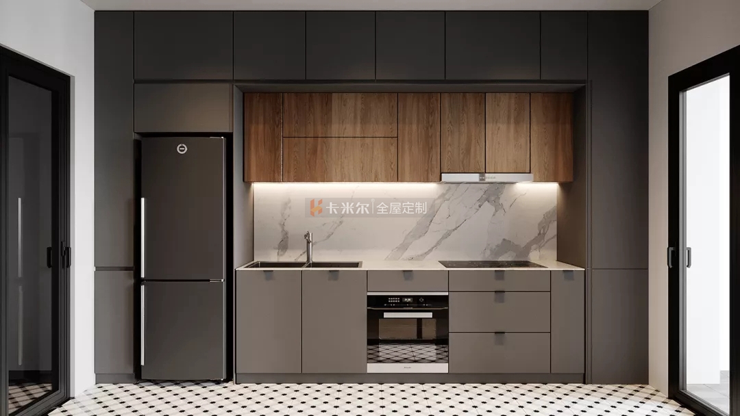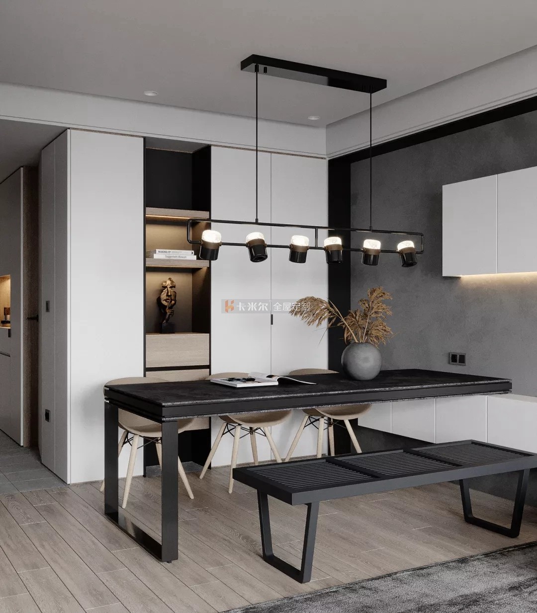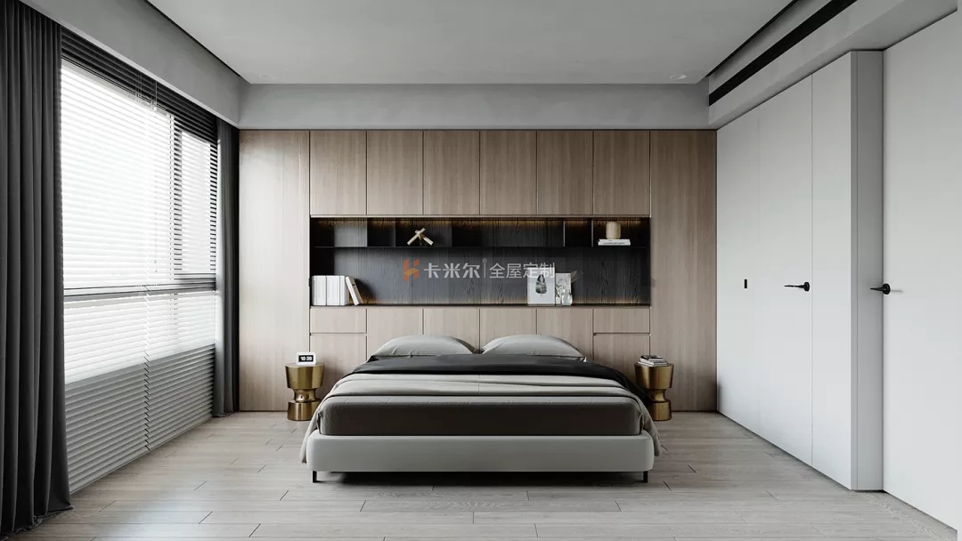 以溫馨舒適的木色,高級黑白灰為主色調,搭配鮮明利落的黑色,色彩與材質的對比使用使得整個家充滿更多設計感,使整個空間簡約不失功能性。