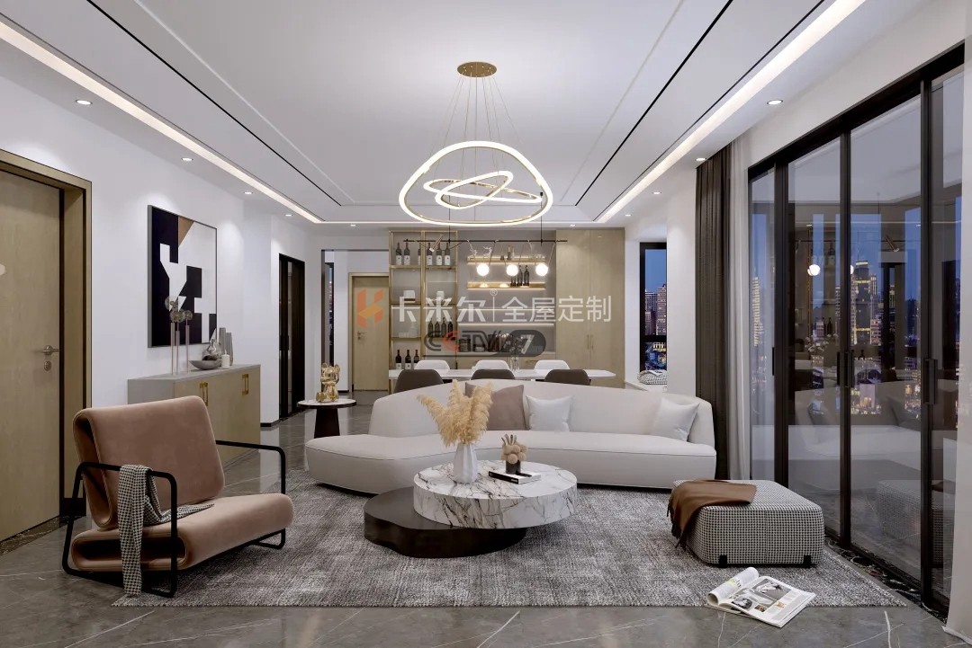 餐廳的設(shè)計更是簡潔大氣,極簡精致的吊燈配合大理石板的餐桌,現(xiàn)代感十足。餐邊柜貼合空間設(shè)計,多個功能區(qū)域結(jié)合,在LED燈的烘托下,溫馨柔和,并且舒適又時尚,提升空間品味。