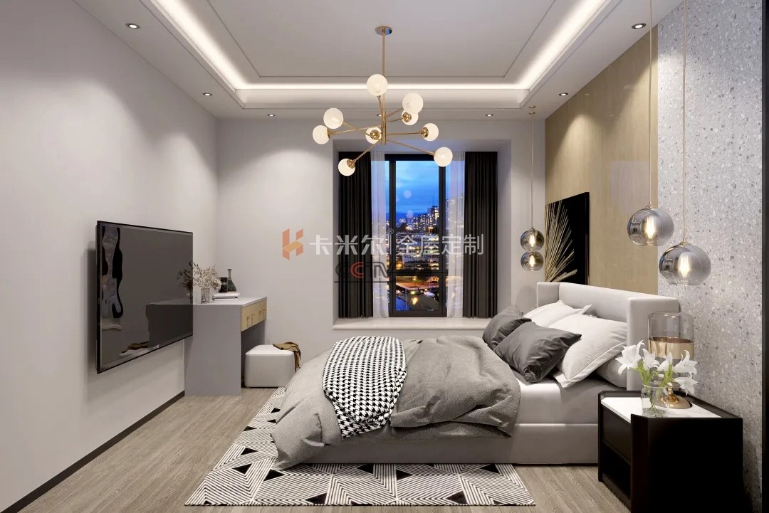 高雅的色彩讓主臥散發(fā)著舒適又輕奢之氣,一堆設(shè)計在門邊對稱而立,并且透露著時尚的金屬質(zhì)感,使空間增添了魅力與情趣。