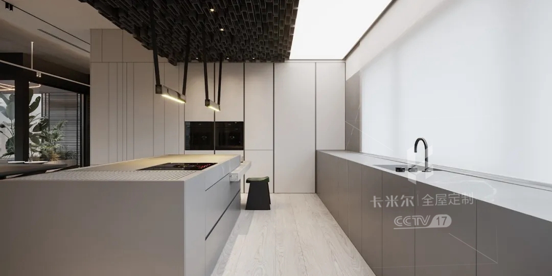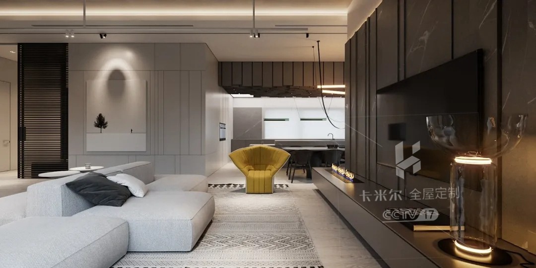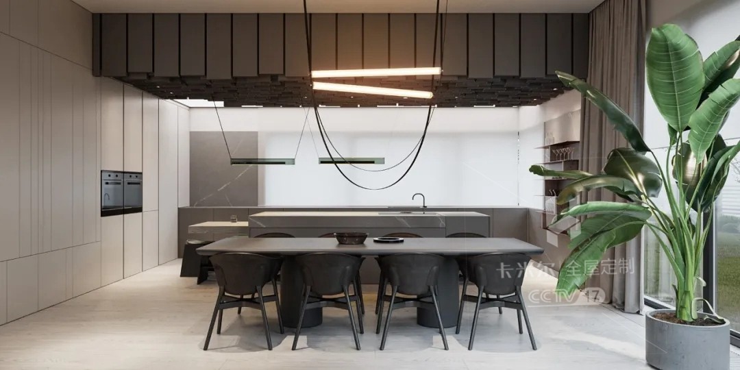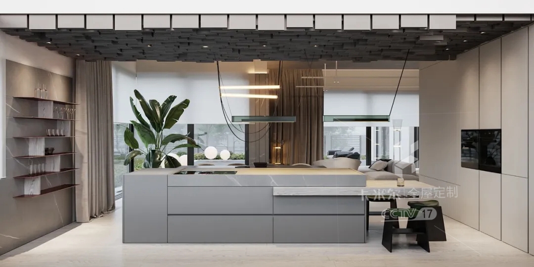 廚房、餐廳與客廳連為一體,開闊無(wú)阻隔,加上大面積使用時(shí)尚豎紋,整體視覺流暢空曠,原木色、灰色的混搭,淺灰色布藝沙發(fā)畫龍點(diǎn)睛,讓空間更具層次感。