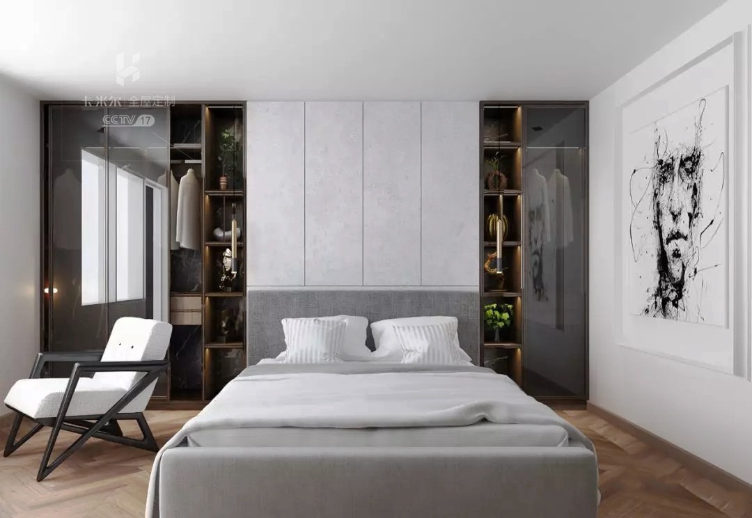 磨砂玻璃能夠創(chuàng)造朦朧美,讓衣柜空間不完全裸露??酒岵AХ褐哪贪咨?,讓人覺得很柔美,同時它能夠極好的隱藏起衣柜內(nèi)部,保留了主人更多的隱私。
