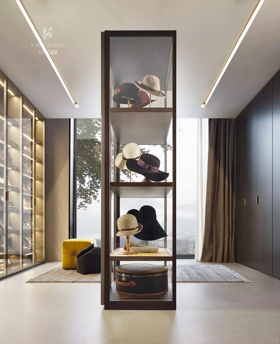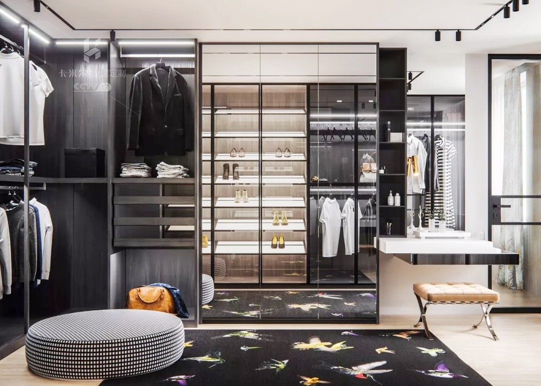 透明玻璃衣櫥往往會選擇黑色門框,這樣可以更加突顯簡潔、清爽。貼身衣褲和常用的浴巾可以收放在抽屜柜內(nèi),以防灰塵污染。