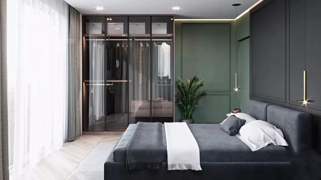 有色玻璃衣櫥不僅可以增加衣柜的私密性,讓衣柜的凌亂不至于裸露。而且色調(diào)更加多元化,可以讓衣柜與空間的搭配更加和諧。