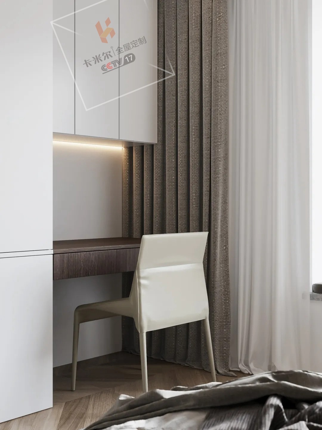 臥室延續(xù)客廳的設(shè)計(jì),柜體整體白色基調(diào),全按彈式設(shè)計(jì),使用便捷同時(shí)兼顧美學(xué)視感。柜體按照儲(chǔ)物功能,劃分柜體結(jié)構(gòu)。搭配深棕色木飾面桌體,抽屜形式設(shè)計(jì),方便儲(chǔ)物。桌面與衣柜分割線平齊,細(xì)節(jié)的處理也彰顯了對(duì)生活的一絲不茍,精致細(xì)膩。