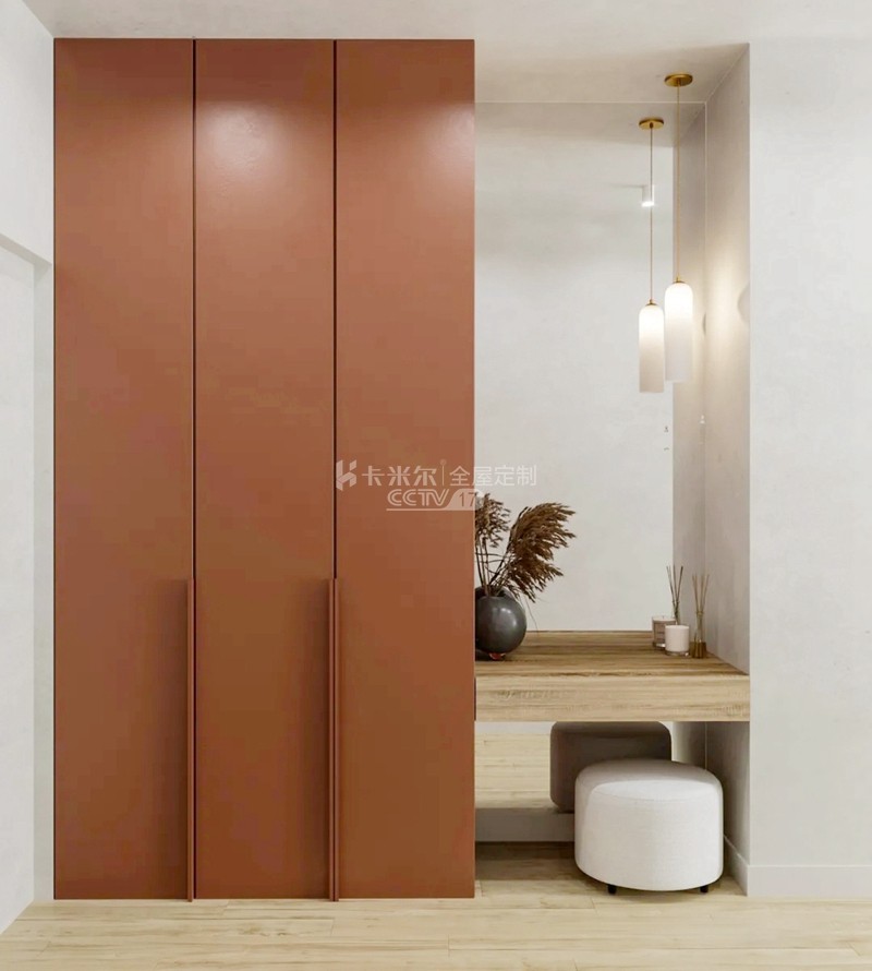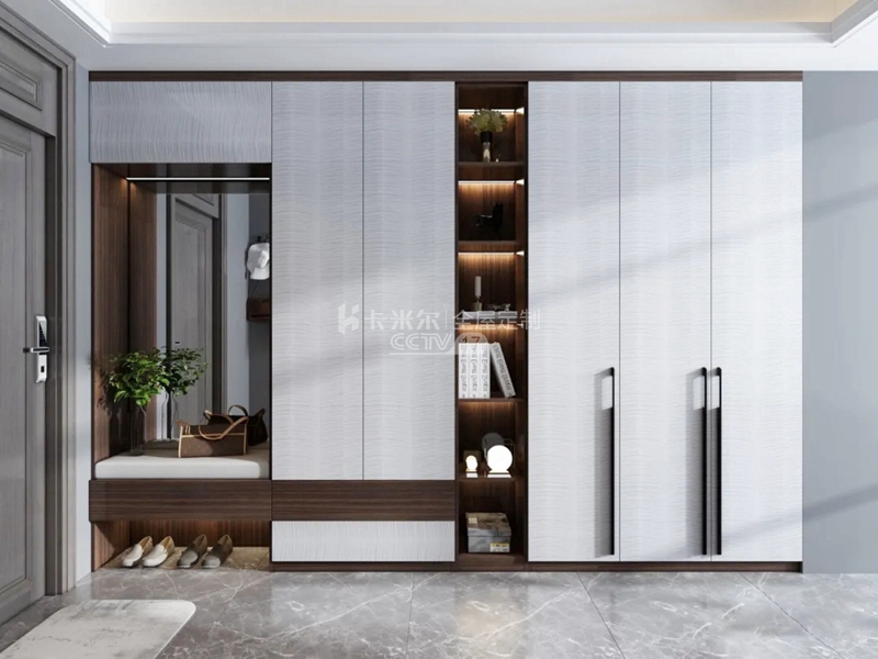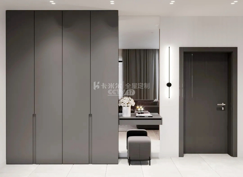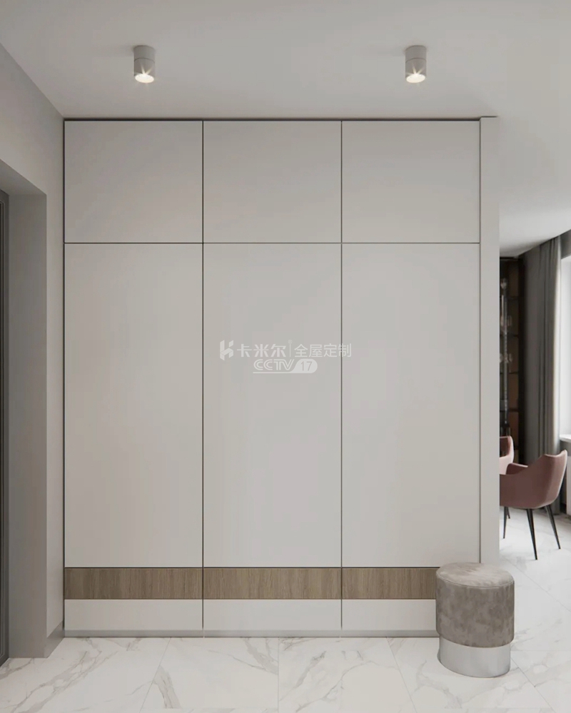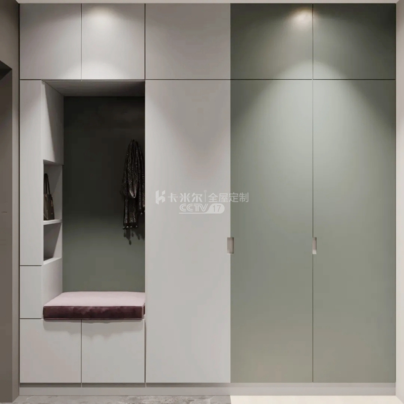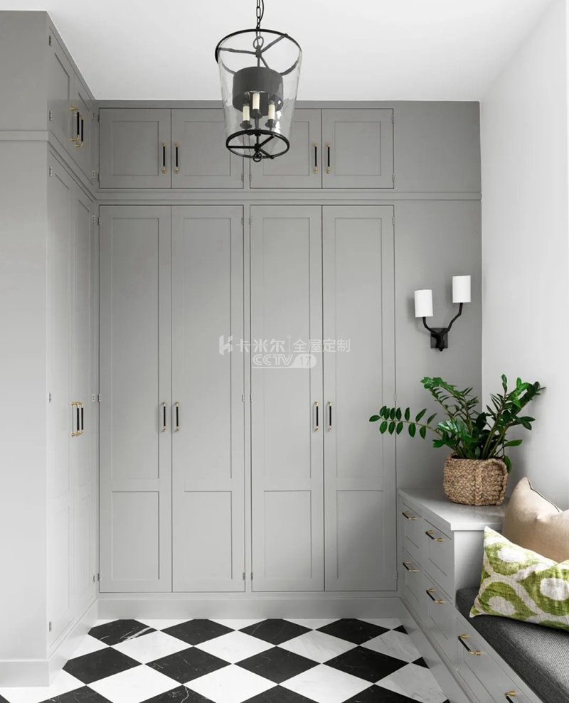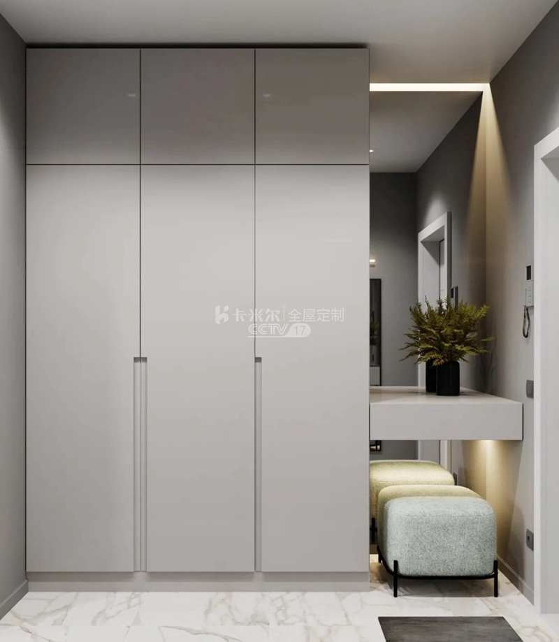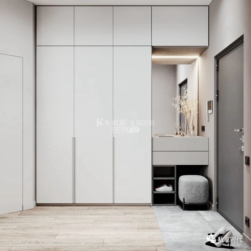 鞋柜的基本配置有地柜、吊柜和高柜,條件允許情況下,可設(shè)計(jì)換鞋凳、懸掛區(qū),裝飾柜等。地柜用途廣泛,可設(shè)計(jì)抽屜;吊柜可收納換季鞋靴;高柜大容量,柜門后可設(shè)計(jì)全身鏡;家有老人小孩,可設(shè)置換鞋凳;裝飾柜根據(jù)空間面積大小考慮。