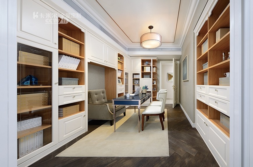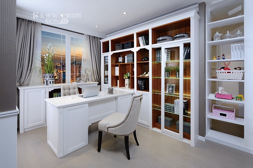 打造書房SOHO區(qū)書房采用白色和木紋拼色設(shè)計,開放展架可以擺放??吹臅脱b飾品,封閉的柜體內(nèi)則可以用來收納雜物,搭配使用確保了書房的干凈整潔。在沿襲歐式的典雅風格上,追求書房的舒適度與實用性。