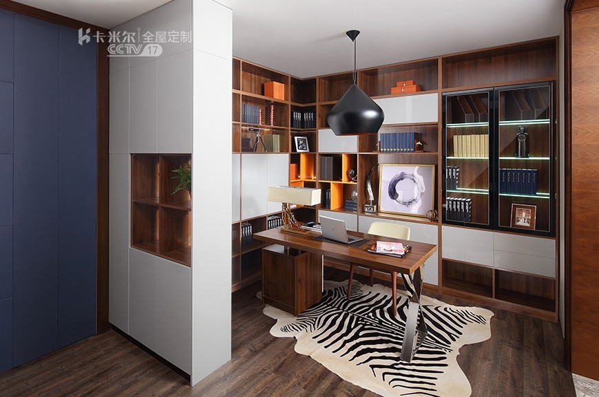 格調(diào)書房的提升你的居家品味流光溢彩配以玻璃層板燈的點綴,呈現(xiàn)了一個高貴,沉穩(wěn),充滿歐洲都市絢麗街區(qū)氣息的書柜。大單元柜以玻璃趟門形式,兼顧了收納與展示效果雙重功能。