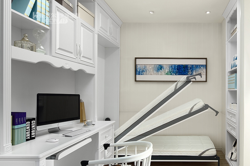 小書房變身客房書柜與下翻床一體化設(shè)計,在滿足閱讀、書籍收納功能外,還可以作為臥室使用,節(jié)省空間的同時提供自由變化空間,一房兩用。