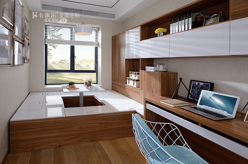 榻榻米已經(jīng)擁有了睡覺、儲物、會客、娛樂等多重功能,再加上特殊定制的書柜、儲物柜和書臺,那么“功能房“的美譽則是實至名歸。