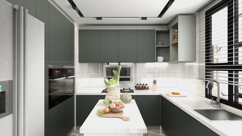 U字型整體櫥柜流暢的線條,現(xiàn)代質(zhì)感的板材,EO環(huán)保板,環(huán)保更安心,標(biāo)配原裝進(jìn)口百隆鉸鏈,耐用更長久。