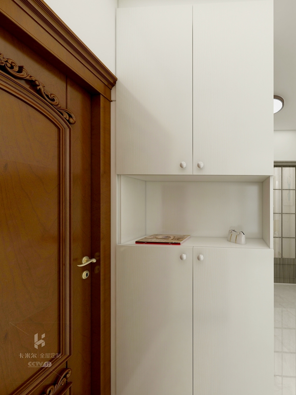 入戶左右側(cè)收納柜鞋柜和餐邊柜的功能,白色柜門搭配黑色拉手,滿滿的高級感。