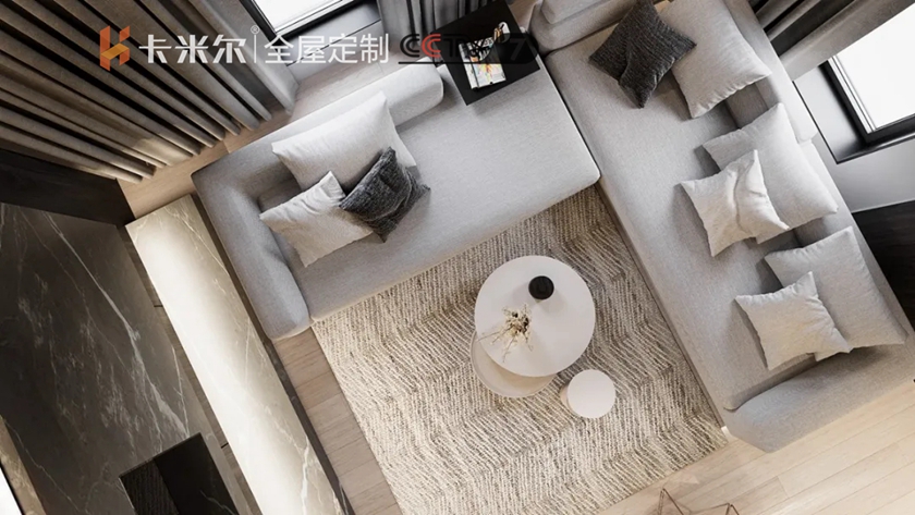 客廳的電視柜是定制設(shè)計(jì),周圍環(huán)繞著一圈,金屬裝飾架,隔板的間距不是固定的,營(yíng)造出隨機(jī)不對(duì)稱性,與排列整齊的條木飾面形成對(duì)比,賦予強(qiáng)烈的視覺(jué)效果。