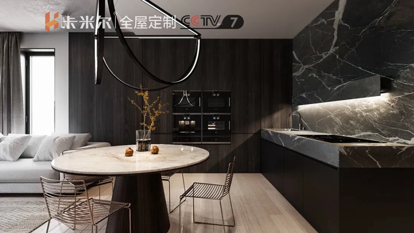 開(kāi)放式廚房棕色的廚柜,啞光板材,與周圍白墻形成對(duì)比,中島臺(tái)面采用高級(jí)灰大理石,搭配金色黃色鏤空的藝術(shù)吊燈,更顯奢華高級(jí)。
