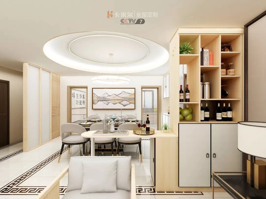 隔斷柜設(shè)計(jì)為酒柜,側(cè)邊圓弧線條優(yōu)美。