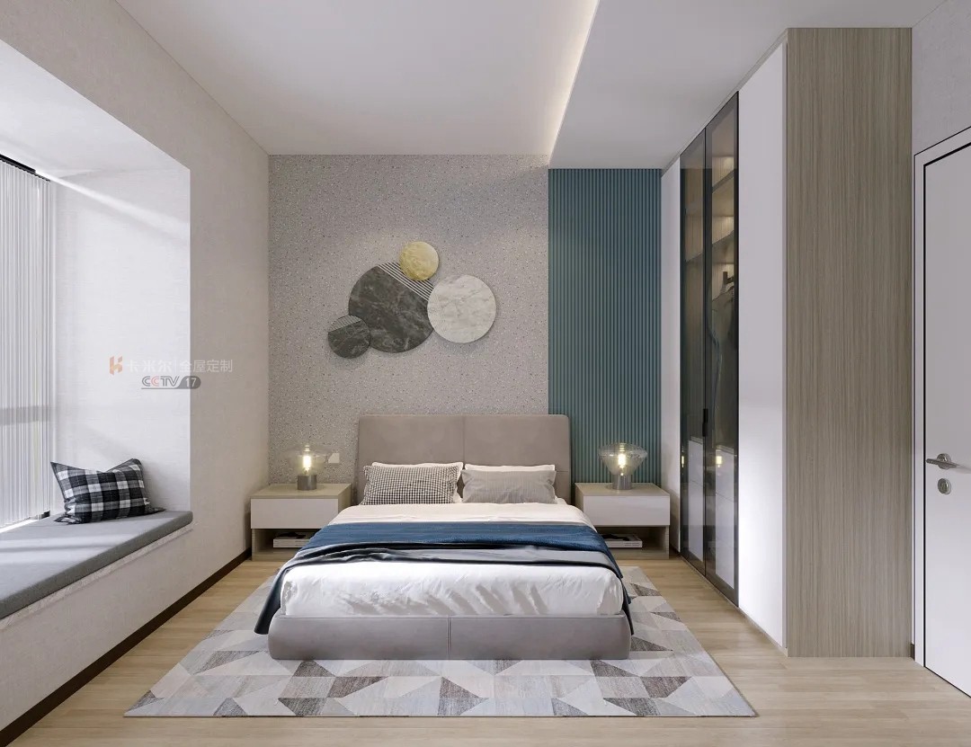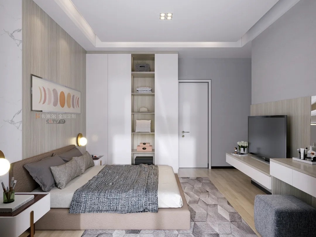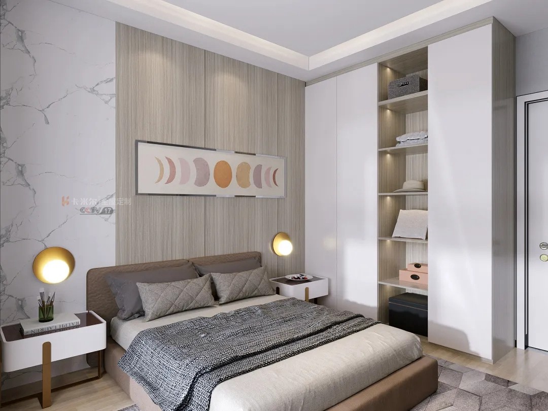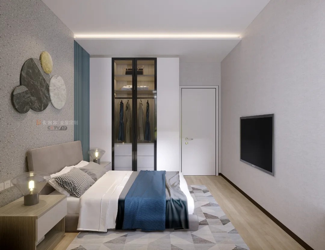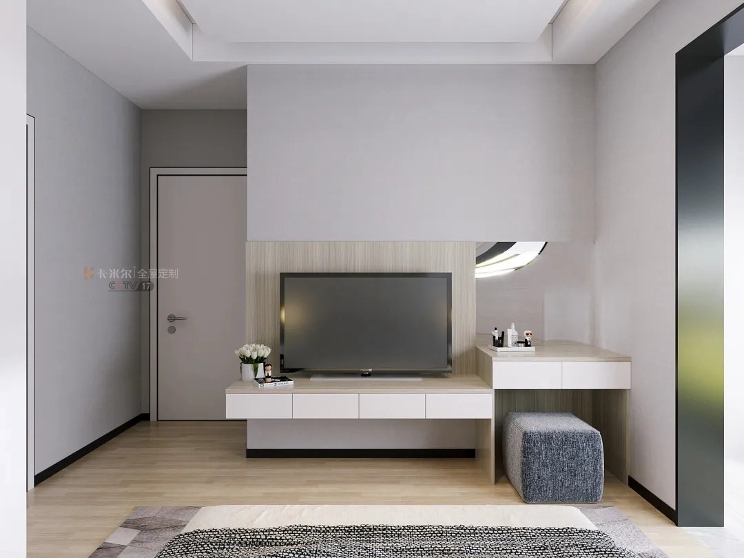 主臥保持與客餐廳一致的調(diào)性,床頭畫的亮色作為空間點(diǎn)綴,營造更加溫馨的氛圍。衣柜一門置頂,留出一列展示格,巧妙地與電視柜柜板花色呼應(yīng),顯得整個(gè)空間更加精致。電視柜與梳妝臺一體化設(shè)計(jì),簡約之中透露美感,同時(shí)又充分利用了空間。
