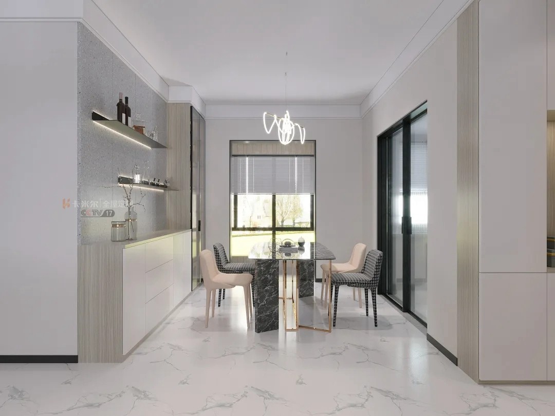 客餐廳隔而不離,減少兩個(gè)功能區(qū)的隔閡,增加了使用面積,同時(shí)也讓采光和通風(fēng)性得到了大大加強(qiáng)。餐邊柜貼合空間設(shè)計(jì),滿腔的柜體充分滿足日常儲物,并且還有玻璃掩門設(shè)計(jì)的展示柜,機(jī)具藝術(shù)館,展現(xiàn)獨(dú)到的審美與品位。