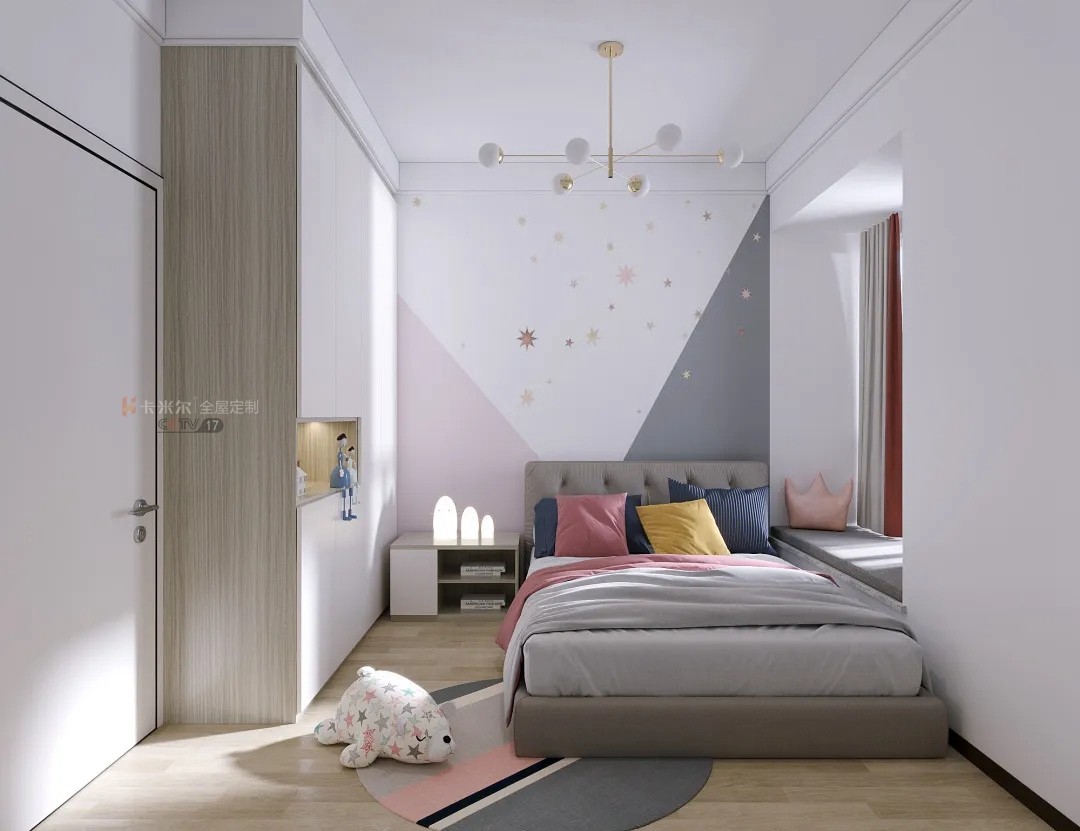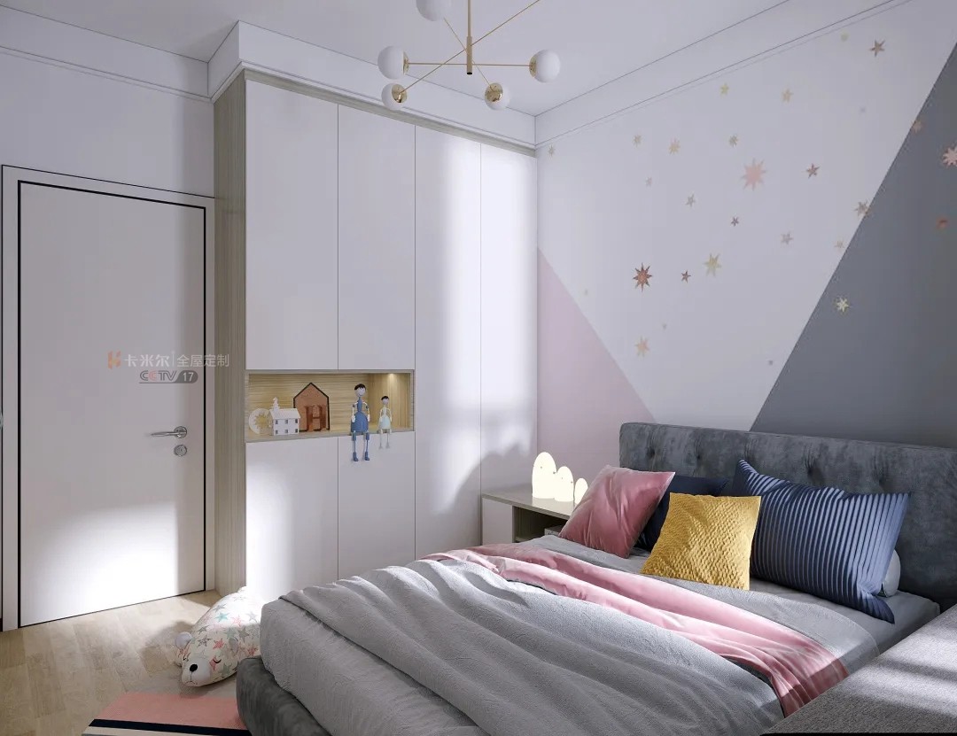 兒童房從童話中獲取靈感,床頭墻面用星星點(diǎn)綴,床尾墻面還裝飾上彩色云朵,充滿夢幻色彩。衣柜中部還留出展示區(qū)域,精致的童趣小物件使得空間層次豐盈,衣柜簡潔大體,整個(gè)兒童房柔軟而溫馨。