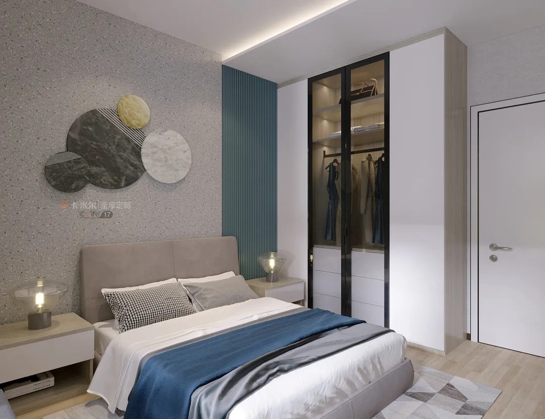 不期而遇的溫暖和自然愜意的恬淡,次臥的設(shè)計(jì)非常簡潔,富有藝術(shù)情調(diào)的床頭裝飾意味盎然。衣柜中部還采用黑色金屬邊框與白色柜板形成了強(qiáng)烈對比,打破空間的單調(diào),品味出品質(zhì)生活的藝術(shù)感。