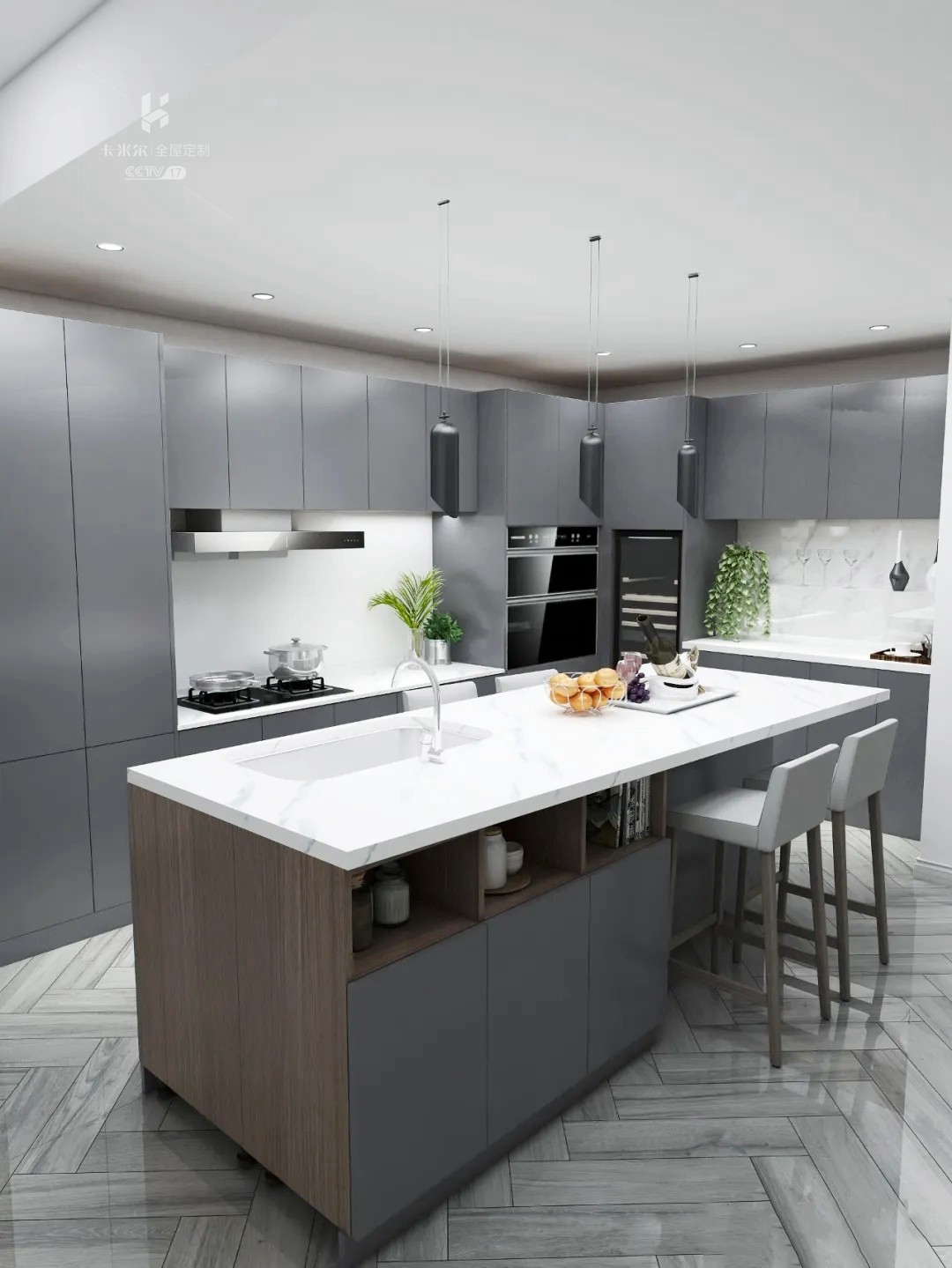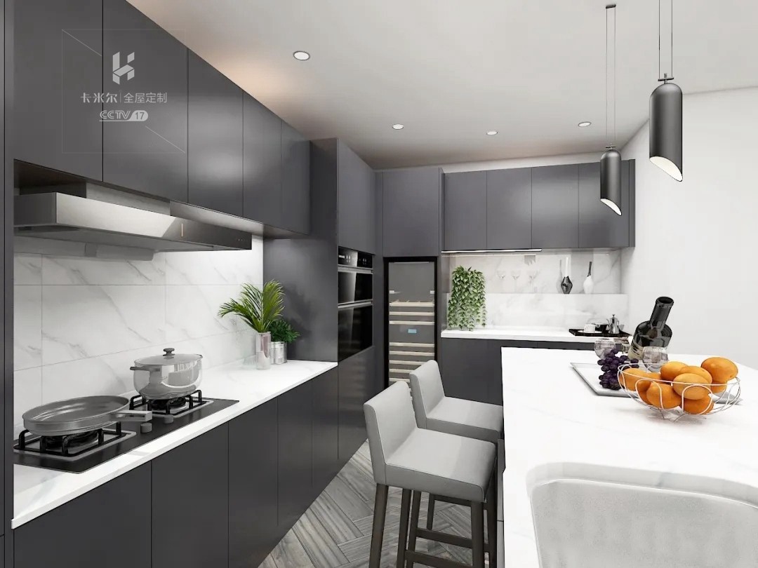 廚房做的開(kāi)放式廚房,讓整個(gè)空間更為敞亮,當(dāng)女主人做飯時(shí)候也能一邊做飯還可以邊看電視、照看孩子還可以和家人交流。