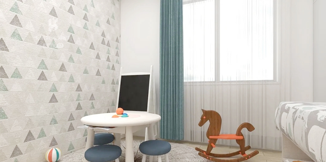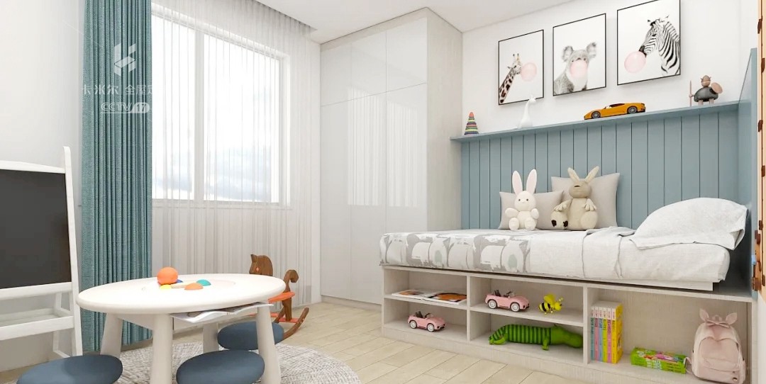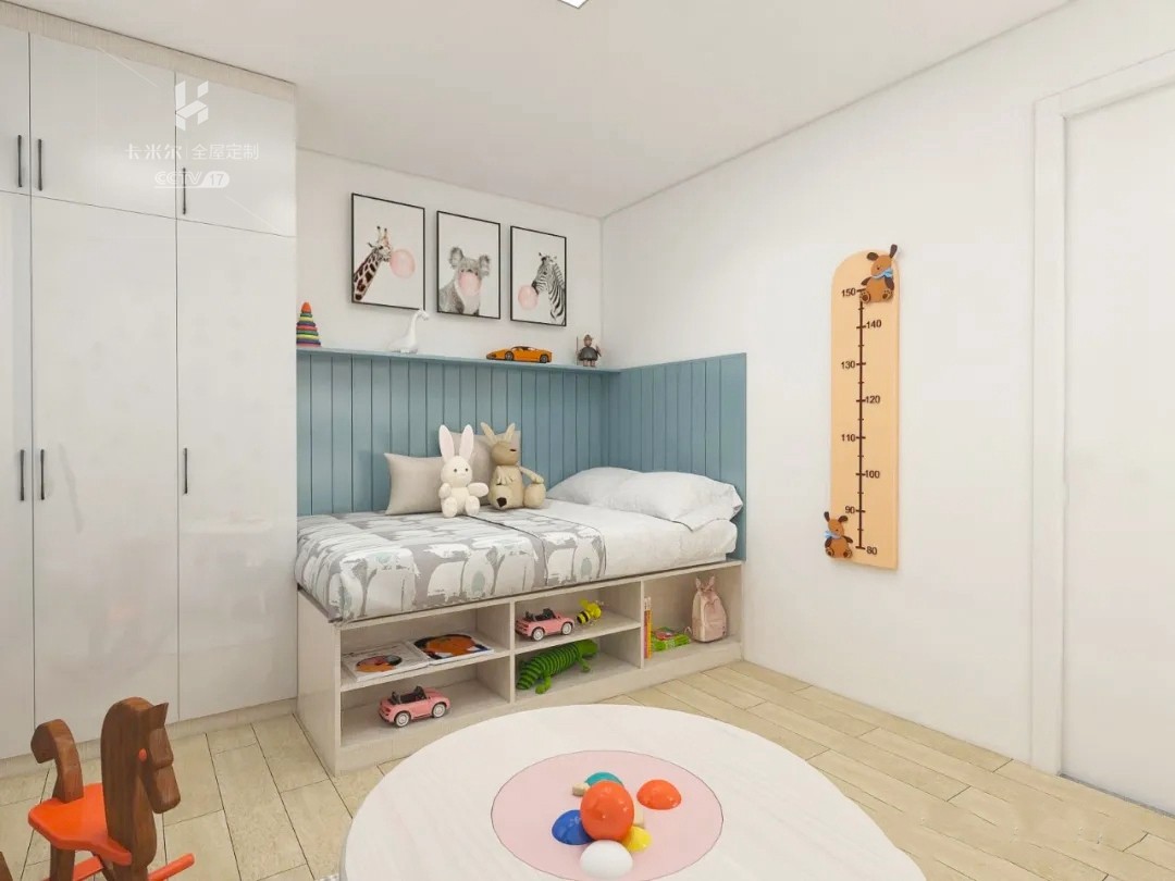 兒童房靠墻榻榻米和到頂衣柜滿(mǎn)足孩子成長(zhǎng)中所需的儲(chǔ)物空間,房間里預(yù)留出更多的空間作為孩子的樂(lè)園。