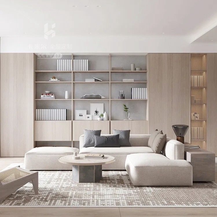 ▼ 設計師根據(jù)戶型特點打造了客廳格局,沙發(fā)背后定制大面積書柜,并且空間整體以沙發(fā)區(qū)域為中心,不僅感覺踏實安穩(wěn),更多了幾分嫻靜氣質(zhì)。