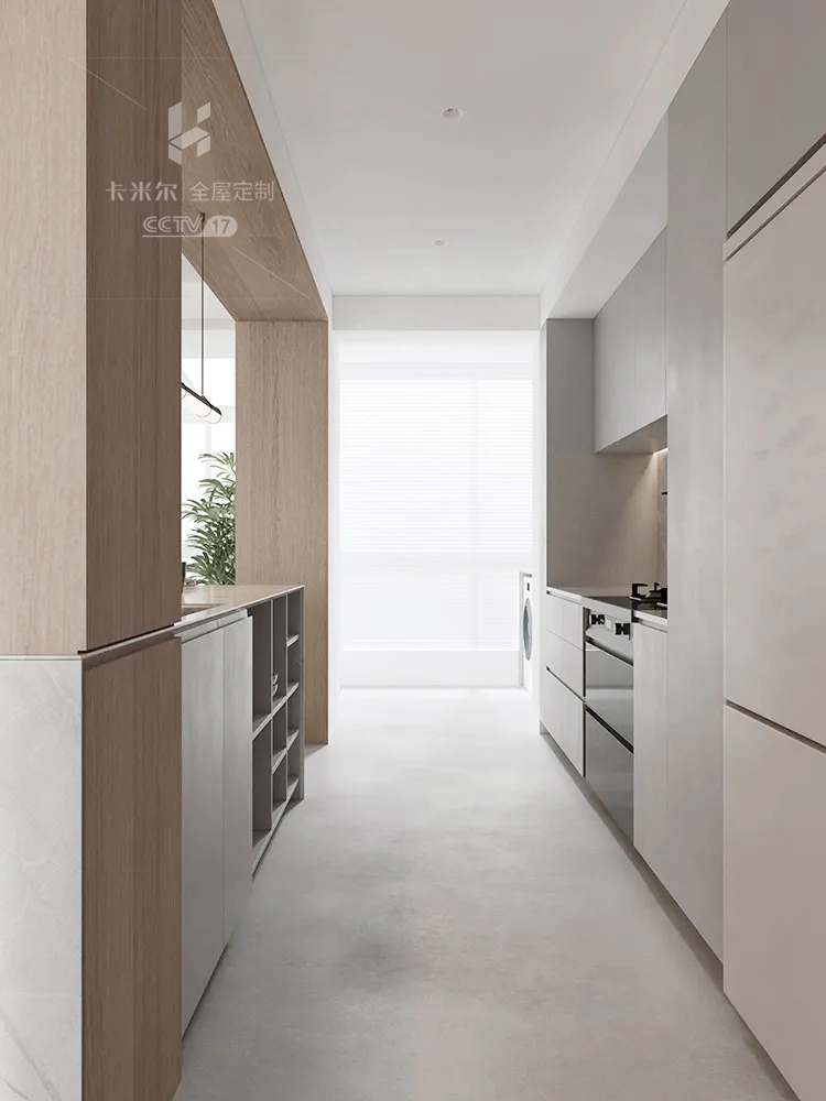 ▼ 二字型廚房設計符合戶型格局,將操作區(qū)和烹飪區(qū)分隔,人造大理石的臺面不僅很獨特,還方便打理,在陽光的渲染下也顯得格外溫馨。