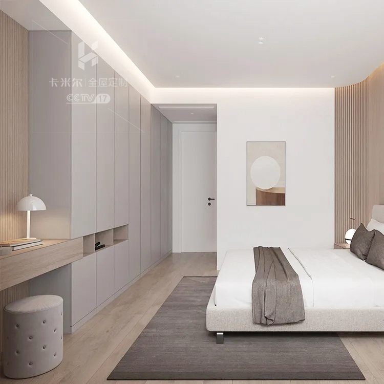 ▼ 床尾用灰色為基調(diào),定制了大面積的衣柜和嵌入式的書桌,兩者的組合不僅保證了居室美觀,更讓不同功能區(qū)完美結(jié)合,滿足生活需求。