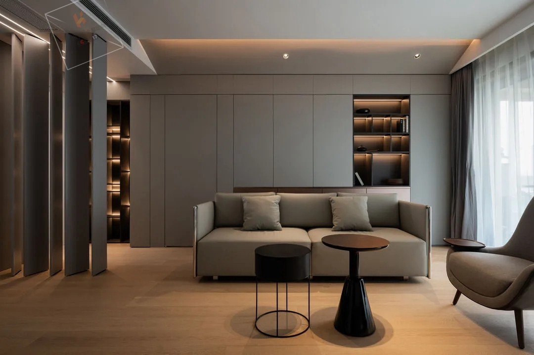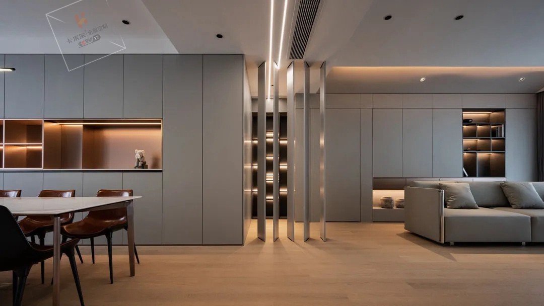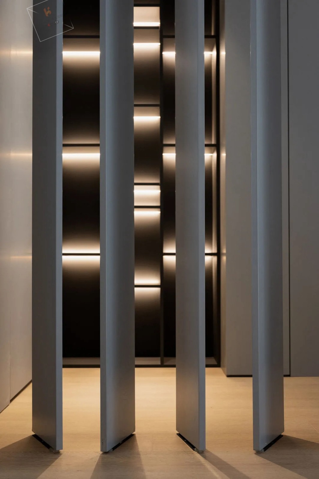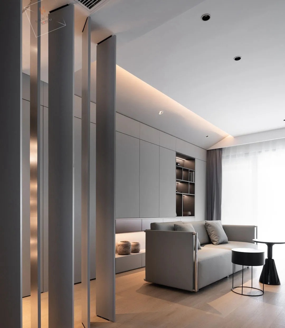 不規(guī)則格柵界定入戶玄關,線型燈穿透頂面延伸至下一個空間,暗喻出空間關系的層次和張力,視線在入戶后能夠貫穿,但是若隱若現(xiàn)的有一個迂回和婉轉(zhuǎn)。