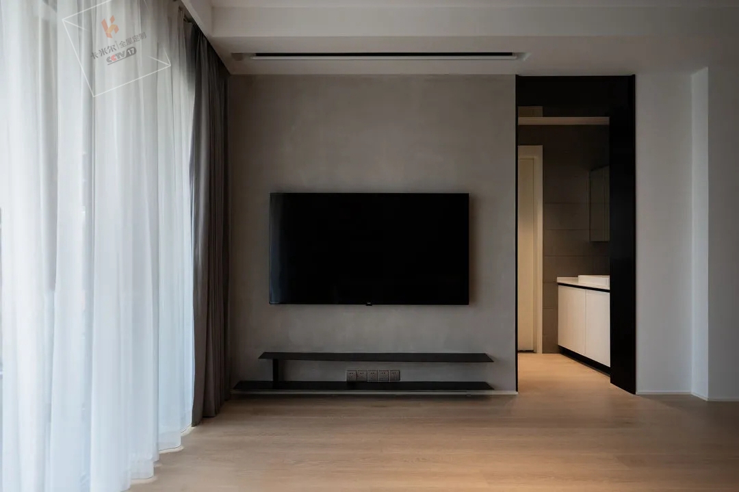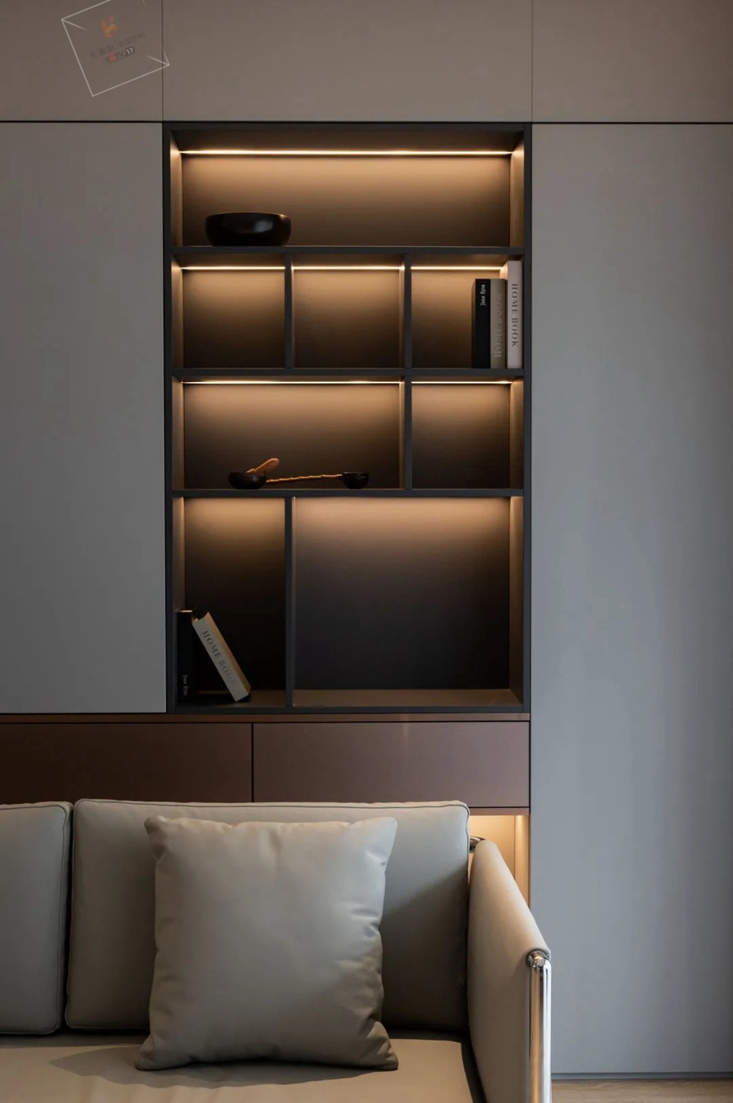沙發(fā)背景墻設計成到頂柜體,將視覺延伸,更顯大氣。開放格能隨手放置物品,更顯方便。
