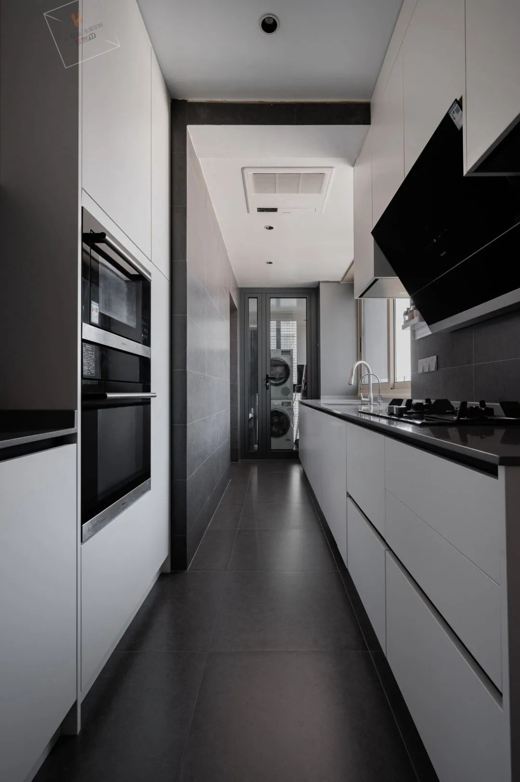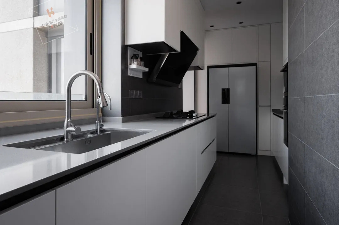 柔和、平靜、穩(wěn)重、和諧、統(tǒng)一、不強烈、不刺眼、沒有沖突,高級灰的瓷磚與白色的櫥柜相映成趣,給人以和諧統(tǒng)一的視覺感受。
