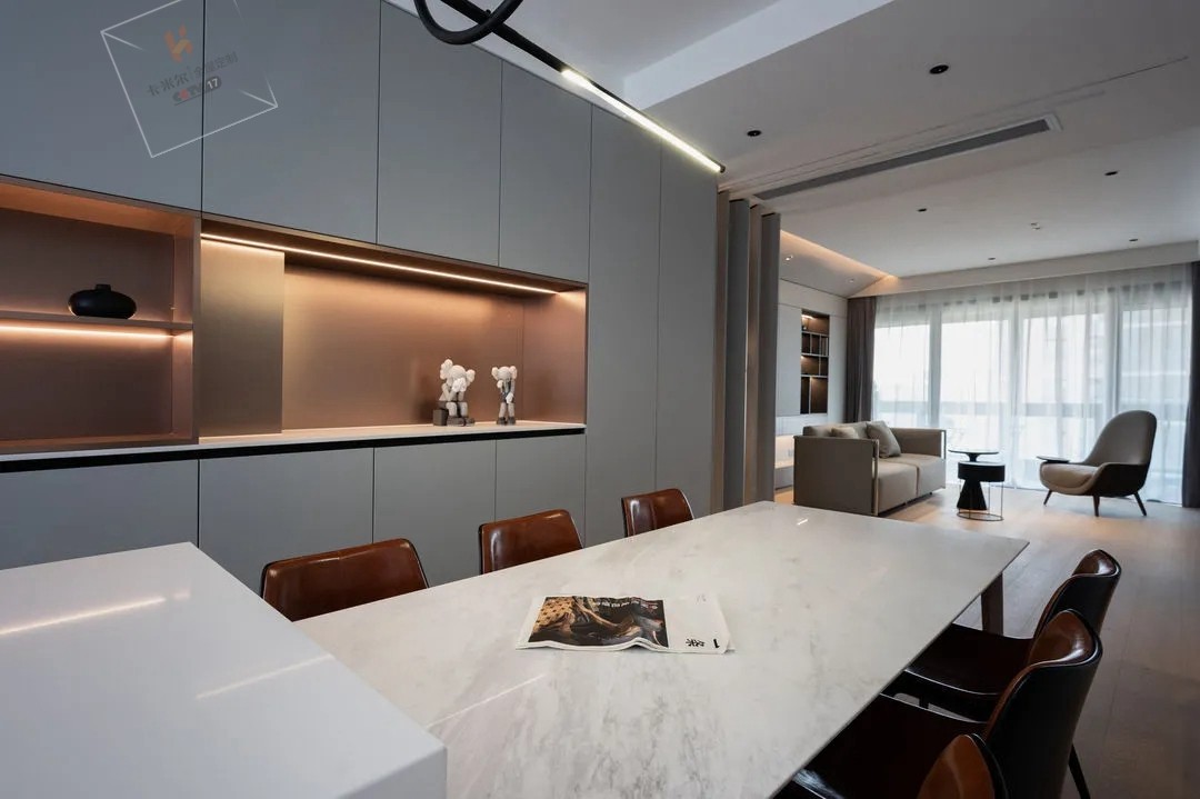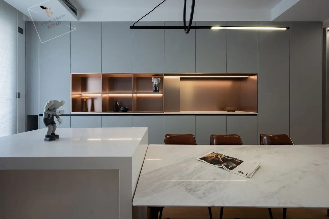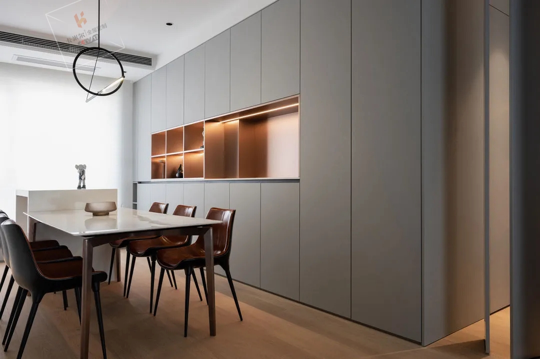 高級灰與金色搭配可以將優(yōu)雅沉穩(wěn)冷靜的魅力最大化彰顯出,運用在餐邊柜上,也可以營造出時尚的感覺,結(jié)合流行的輕奢元素,高雅范兒立即體現(xiàn)出來。