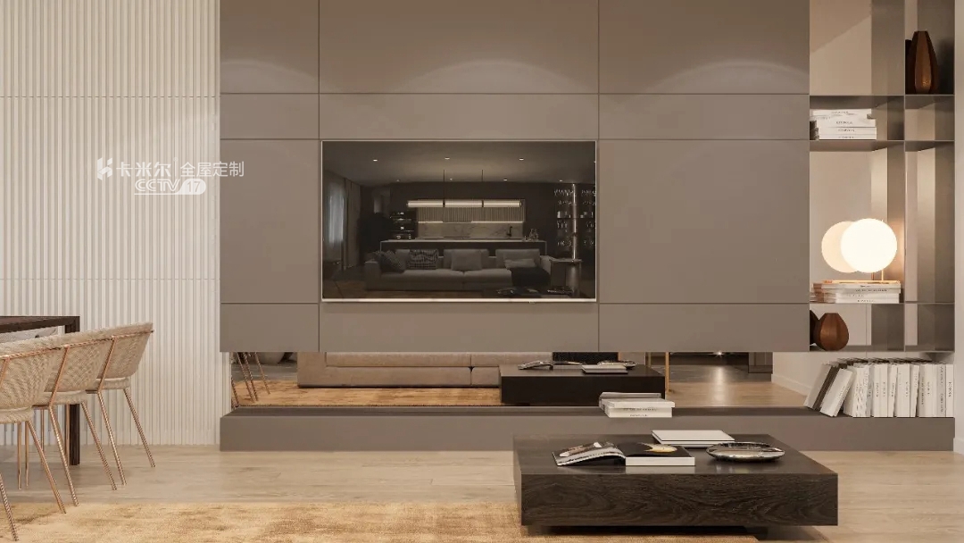 電視上下采用懸浮式吊柜、壁柜、矮柜+吊柜的組合形式將電視包圍起來,不僅大大提高空間利用率,而且看起來很有層次感,實用性超強。