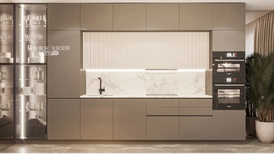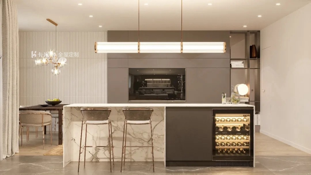 廚房開放空間布局,強化餐廚的開闊感,此處延續(xù)客廳的設(shè)計風(fēng)格,以灰白色為基底,以金屬為點綴,盡顯奢雅高貴。