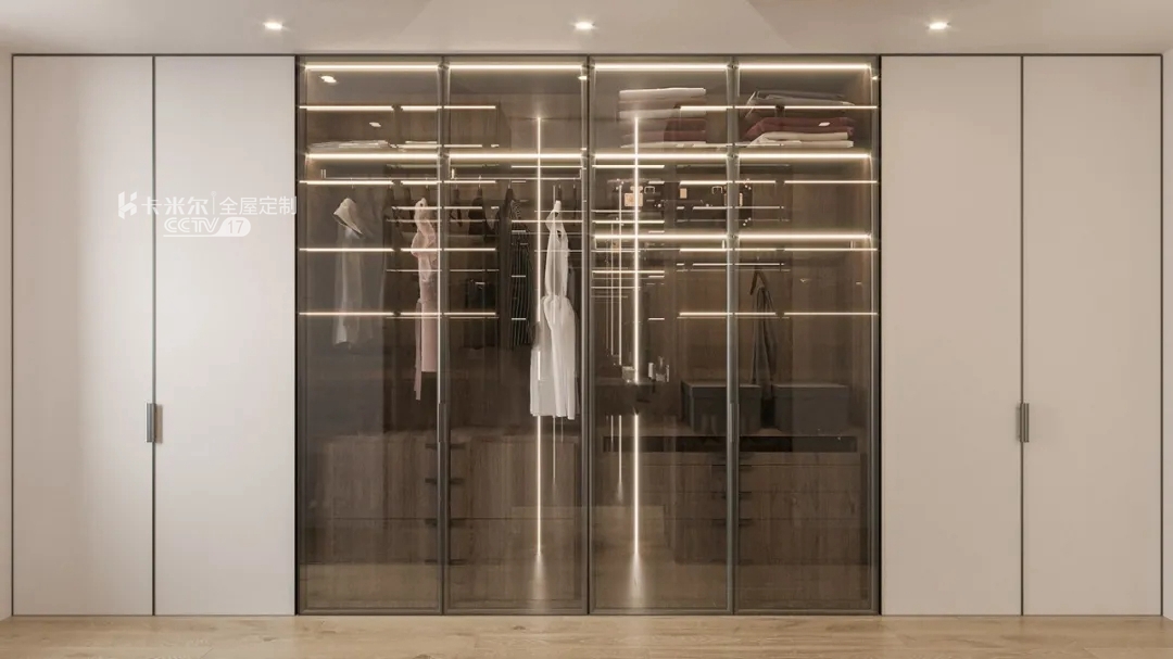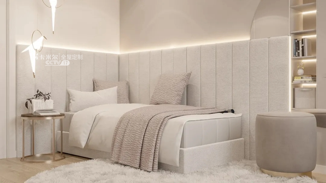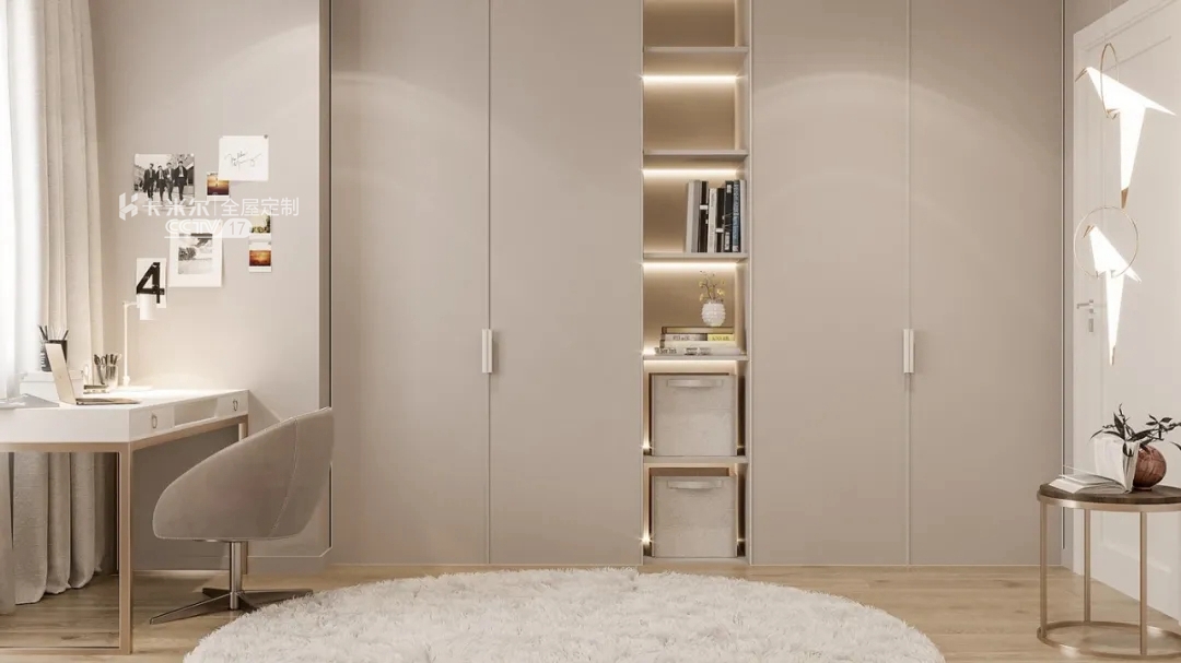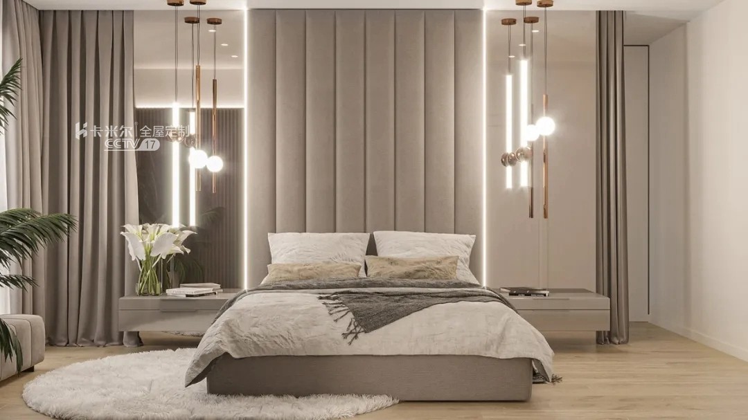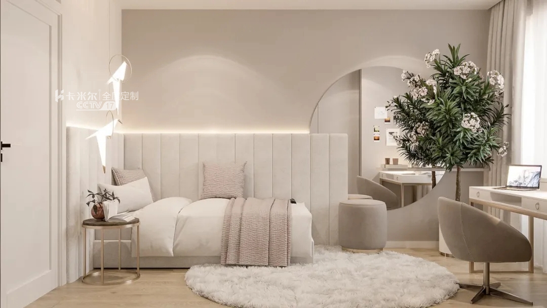 主臥整體空間顏色非常簡單,幾乎全由低飽和度的顏色組成,背景墻的軟包柔軟細(xì)膩,予人冷靜安謐的視覺感受。衣柜時尚輕奢,擺脫雜亂,收納整理。