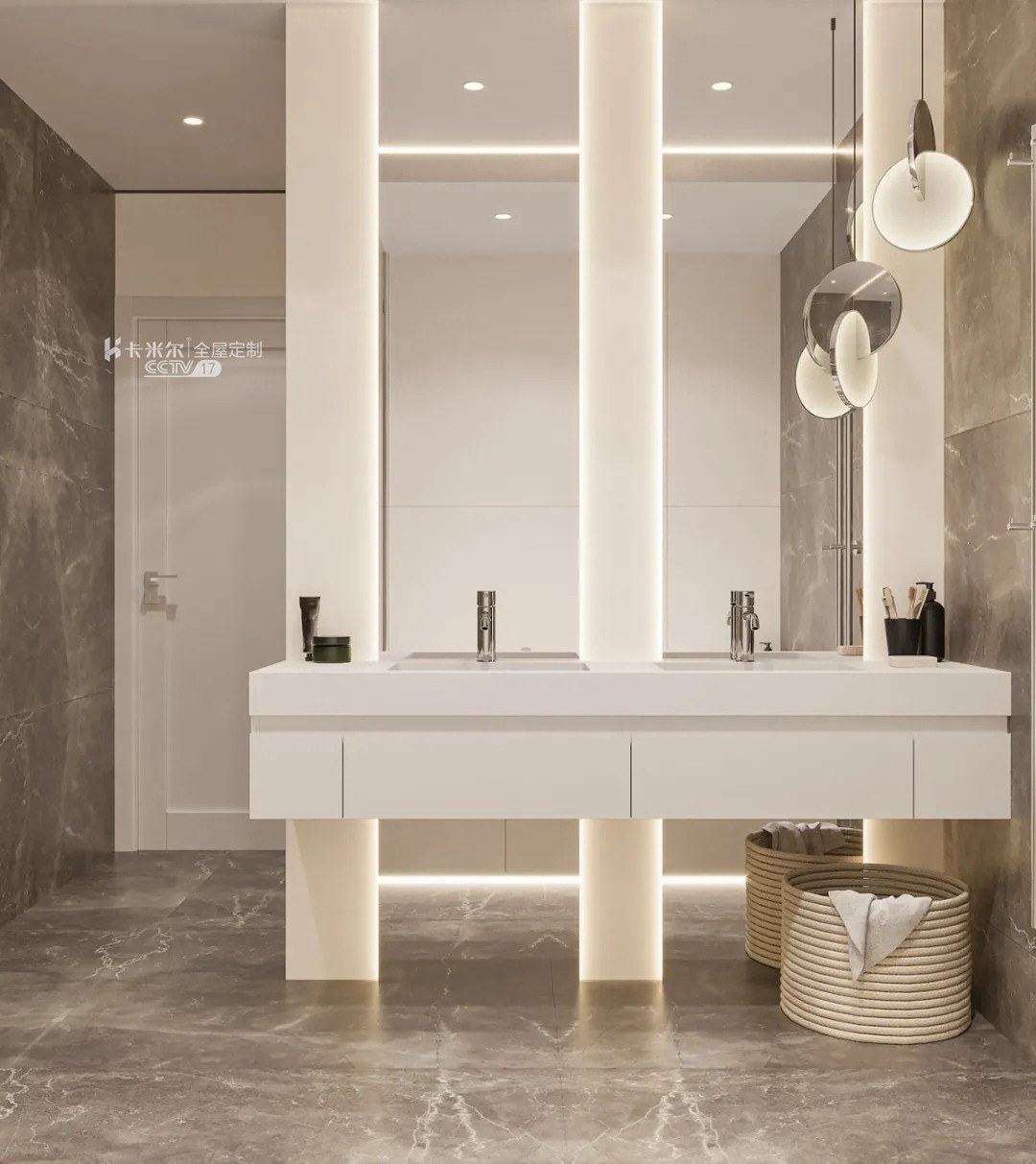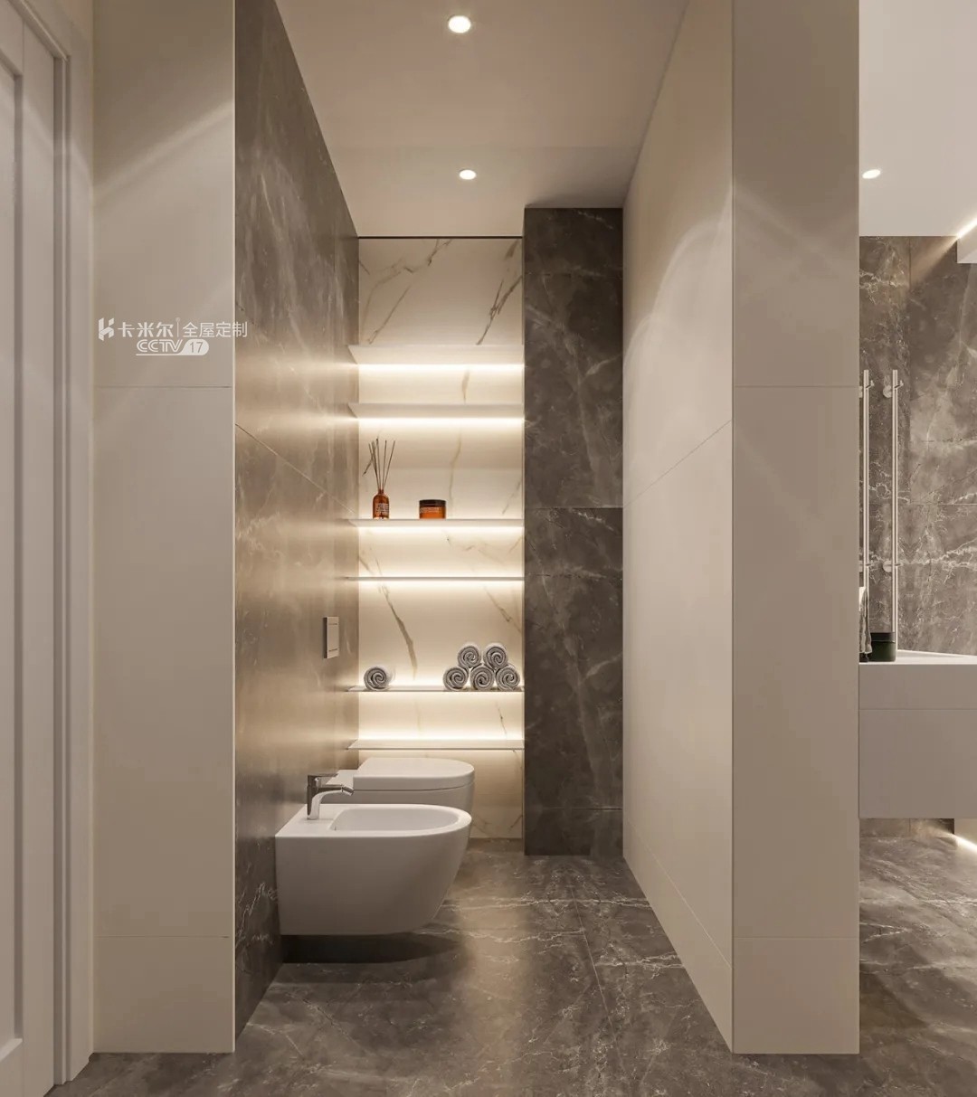 衛(wèi)生間簡約極致,在淺灰色大理石肌理感中與白色調(diào)之間保持著柔和的理性,現(xiàn)代極簡主義中流露出寫意之美,簡雅而素淡。