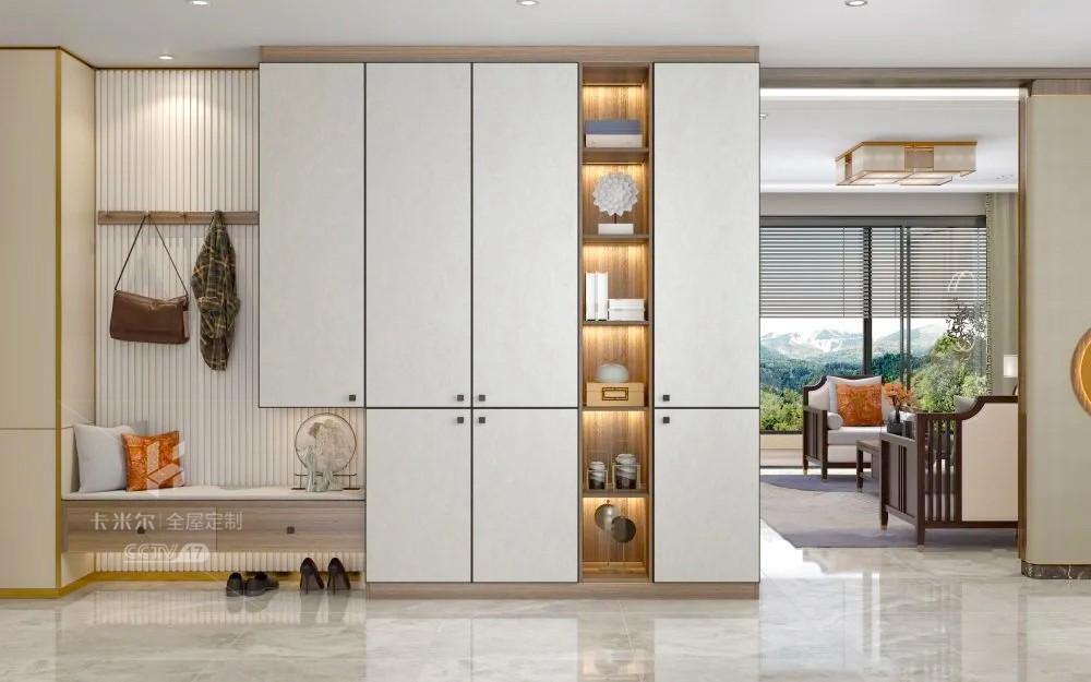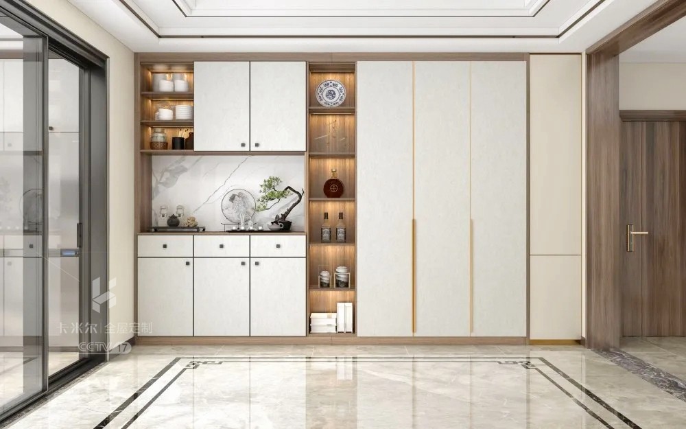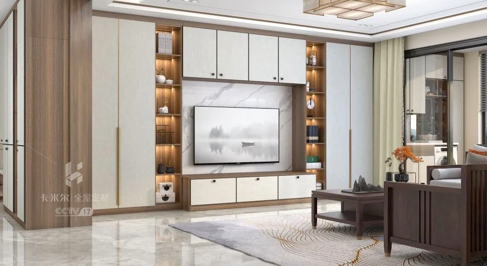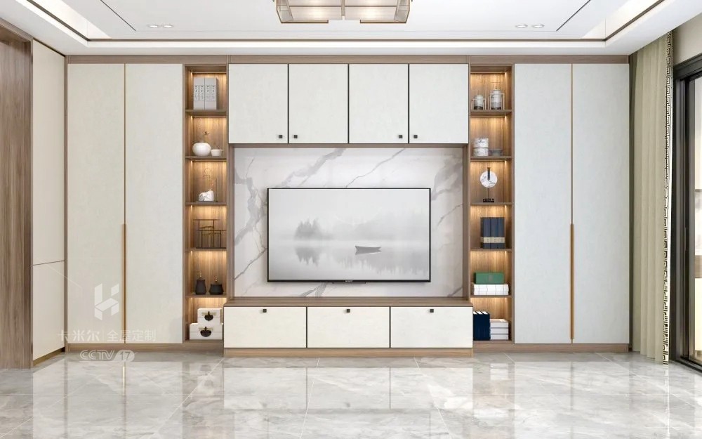 電視柜場景一體化外觀設(shè)計,收納高柜滿足主人的收藏喜好;柜內(nèi)搭配氛圍燈,通透既視,高端尊貴。