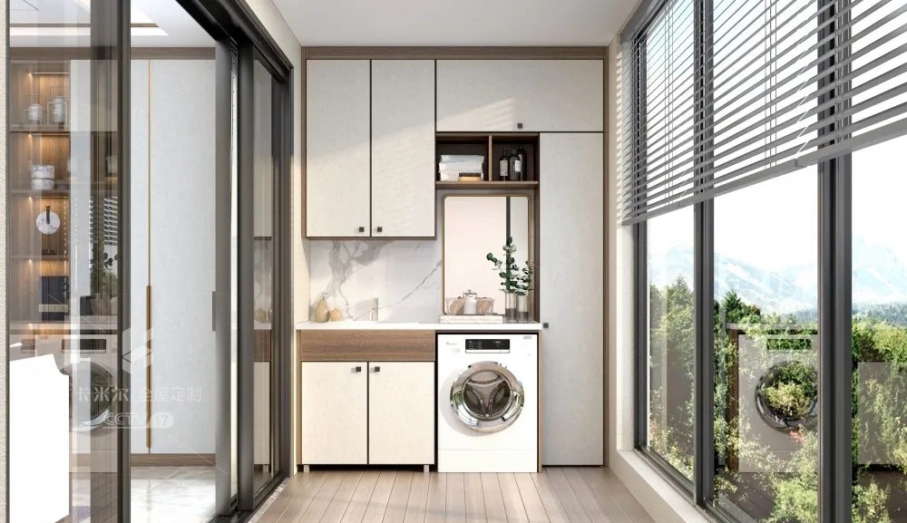 洗晾一體型的陽臺,柜體需要存放的東西更多,騰點空間做裝飾,簡單的可以放上一小盆綠植,一束插花;或者下點功夫,裝個木色或白色的百葉窗簾,有陽臺的時候光影真的美爆了!