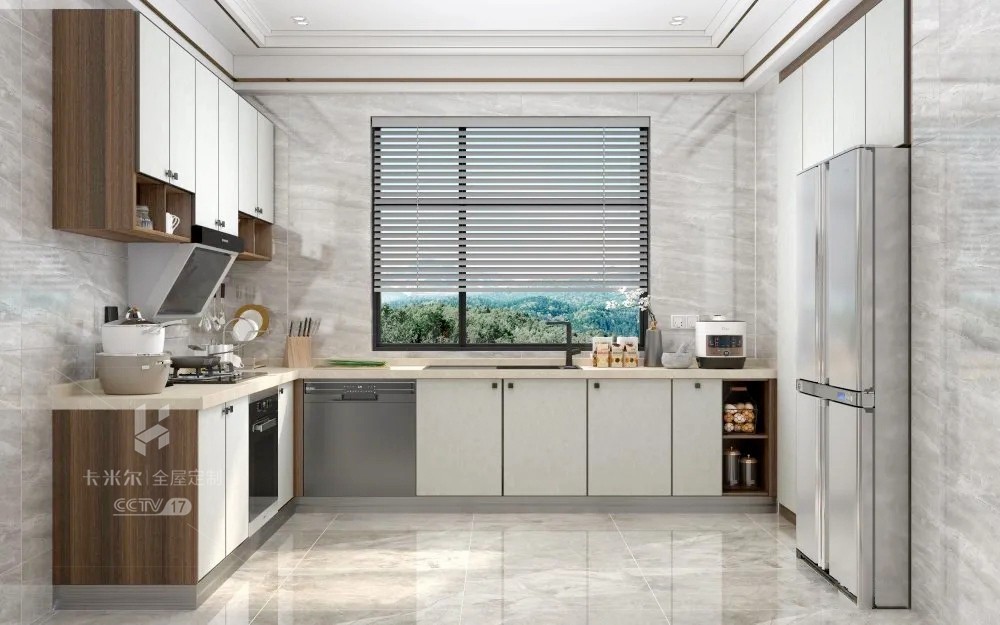 廚柜門板采用雙配色方案,地柜區(qū)選用深棕木紋配色,視覺上營造穩(wěn)重之感吊柜搭配具有現(xiàn)代感的“茶白”。深淺層次分明廚房將經(jīng)典與時尚結(jié)合,打造極具現(xiàn)代生活特色的極簡新中式烹飪空間。