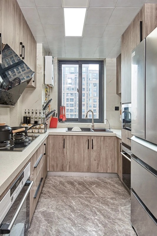 ▲廚房空間大小剛好,布置U字形操作臺(tái),對(duì)開門的大冰箱,定制木色的櫥柜,讓做飯空間顯得更加實(shí)用而簡(jiǎn)約大方。暖灰色的地面,與橡木色櫥柜相呼應(yīng),整體顯得簡(jiǎn)約舒適而溫馨。