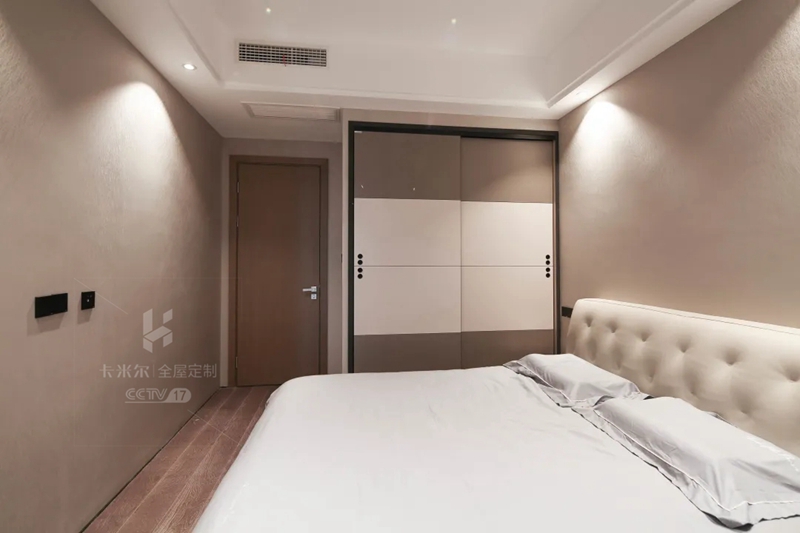 ▲次臥也是咖灰色的墻面空間,布置上一張米白色的皮藝床與白色素雅的床單,衣柜是雙拼色的推拉門柜體設(shè)計(jì),整體空間舒適溫馨而實(shí)用大方。