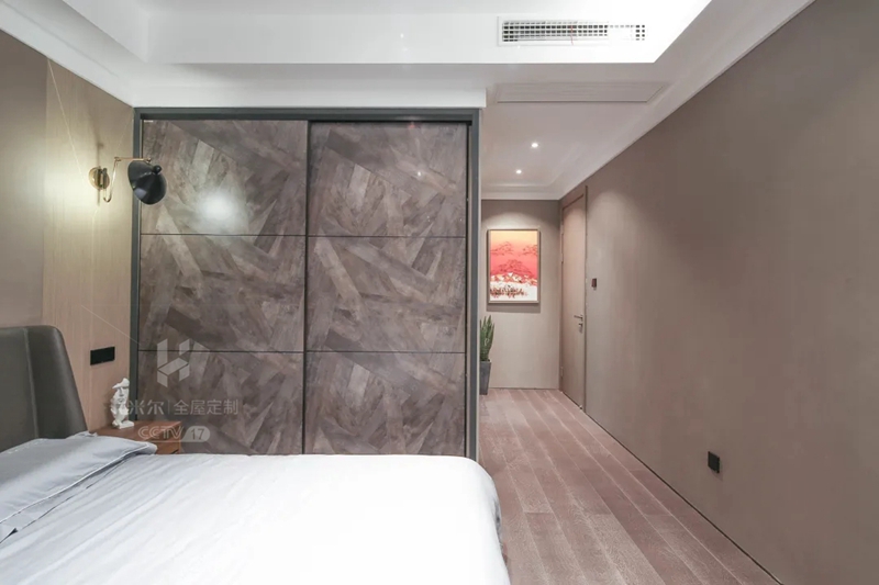 ▲臥室整體咖灰色的墻面空間,定制的衣柜也是以歐松板的柜門樣式,讓空間顯得更加有趣。