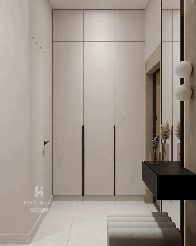 門廳空間,以優(yōu)雅的高級灰拉開了視覺,一面及頂?shù)墓耋w,觸感細膩及簡致的立面,入戶純粹且干凈的視感。