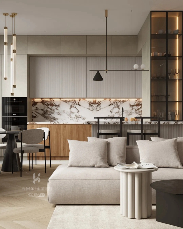 大理石和木飾面包裹一柜到頂?shù)臋还?,更具利落與秩序感,空間層次更顯豐富空靈,靠窗布置的餐廳,黑色大理石餐桌、布藝餐椅與自然光的結合,讓人感受到最大限度的舒適與放松,舒適感足倍遞增。