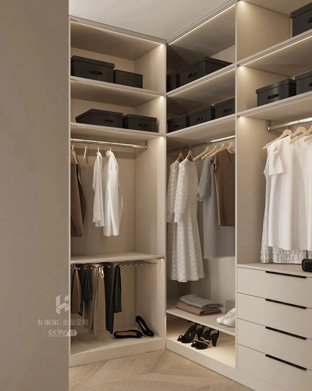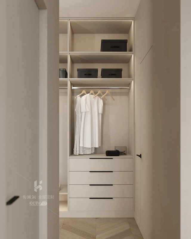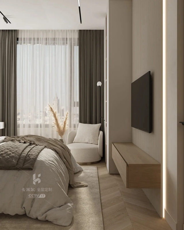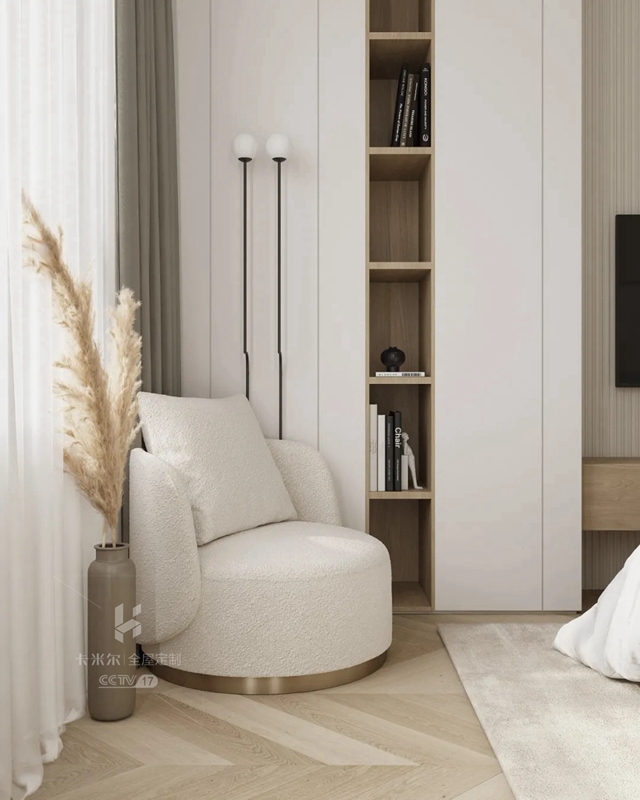 臥室整體的風格,極簡式的表達手法,帶來更多的細膩情感,床頭柜,以木飾面延伸出大理石梳妝臺,燈光的加持,輸出了輕盈而又質(zhì)感的空間美感,營造輕快溫馨的空間氛圍,讓人更加放松,得以更好的休息。