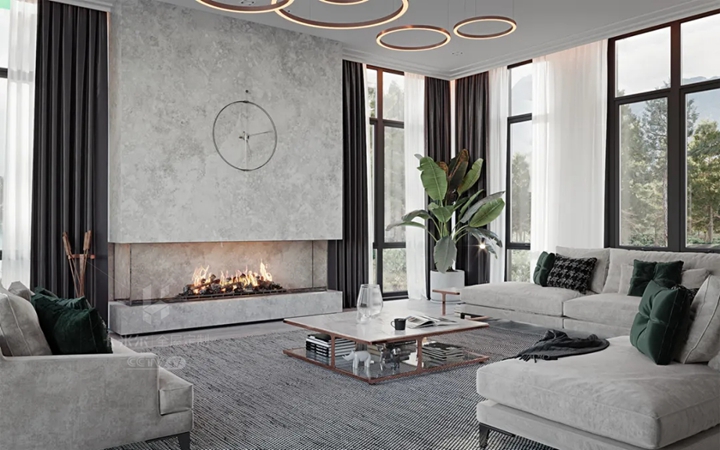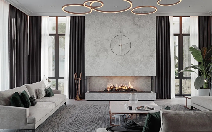 環(huán)狀的金屬吊燈與墻面上極簡(jiǎn)的時(shí)鐘設(shè)計(jì)很是前衛(wèi),前衛(wèi)的時(shí)尚元素與復(fù)古的壁爐元素相結(jié)合,使得整個(gè)空間非常的有層次感,富有內(nèi)涵。