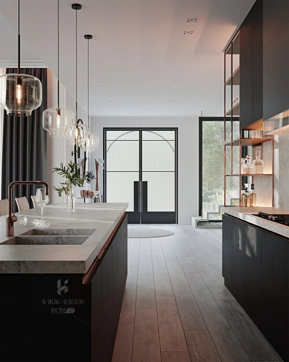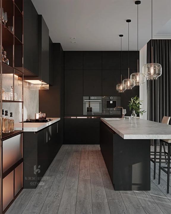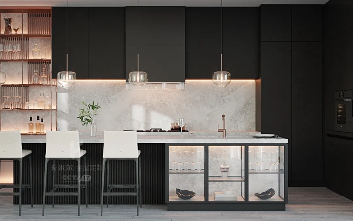 廚房整體的色調(diào)是經(jīng)典的黑白搭配,霸氣且優(yōu)雅,開放式的廚房與客廳相連,視覺上空間更加開闊,一字島臺(tái)的玻璃櫥窗設(shè)計(jì)與簡(jiǎn)約的玻璃吊燈相呼應(yīng),提升了整個(gè)廚房的設(shè)計(jì)感。