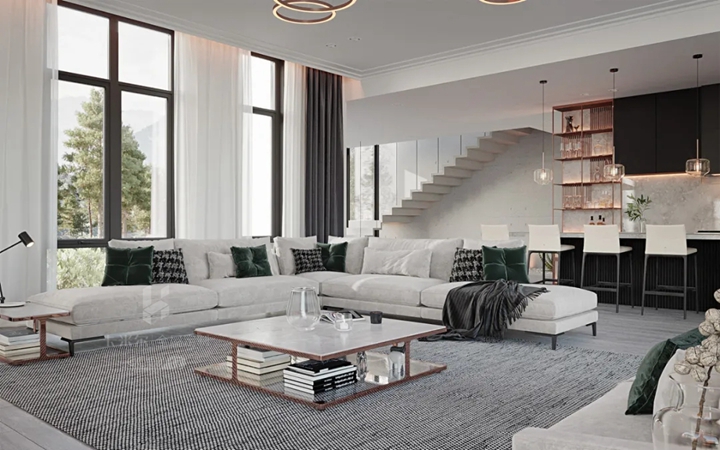客廳里主要的顏色是深灰與淺灰,深灰色沉穩(wěn)優(yōu)雅,淺灰色明亮大氣,簡(jiǎn)潔又獨(dú)具個(gè)性。