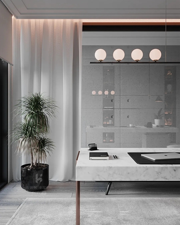 書房柔軟的沙發(fā)與剛硬的大理石,柔軟與堅(jiān)硬的結(jié)合,質(zhì)感更強(qiáng)。桌面上綠植的擺放,能讓人在視覺疲憊時(shí)有所緩解。